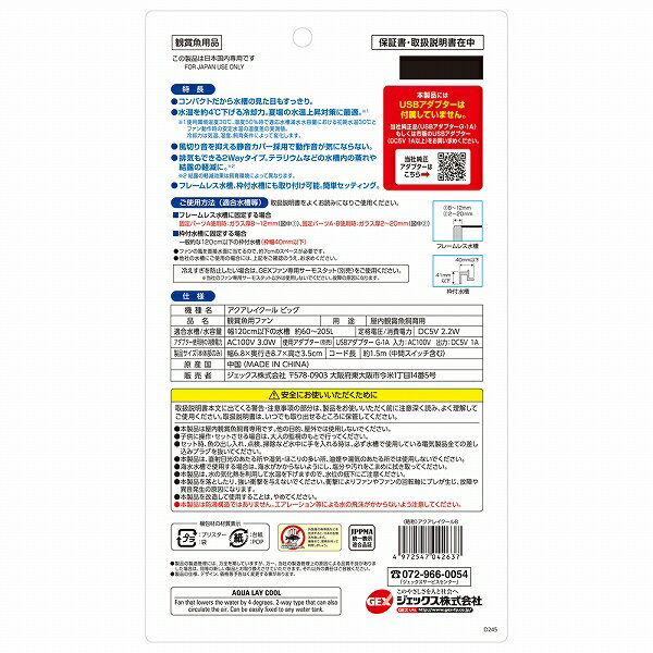目立たずスッキリ 夏の水温管理に。●水温を約4℃下げる冷却力。夏場の水温上昇対策に最適。※使用環境温度30℃、湿度50%時で適応水槽満水水容量における初期水温30℃とファン動作時の安定水温の温度差の実測値。冷却力は気温、湿度飼育条件によって変化します。●適合水槽/水容量:幅120cm以下の水槽 約60-205L●製品サイズ:約幅6.8×奥行8.7×高さ3.5cm(本体部のみ)●コード長:約1.5m(中間スイッチ含む)●定格電圧/消費電力:DC5V 2.2W●アダプター使用時の消費電力:AC100V 3.0W●使用アダプター(別売):USBアダプターG-1A 入力:AC100V 出力:DC5V 1A