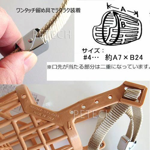 取り付けづらいワンちゃんにも装着が楽なよう、ワンタッチ留め具がついています。口輪部分はプラスチック、口先は二重になっています。ベルトはナイロン製。サイズに合わせて選べる4種類。AとBの長さを参考にしてお選びください。(約)A 7×B 24ミニチュアダックスなど。あくまでも目安です。サイズをご参考にお選びください。※テープが赤からベージュに変更になりました。材質口輪:プラスチック、ベルト:ナイロンメーカー(株)キンペックスインターナショナル