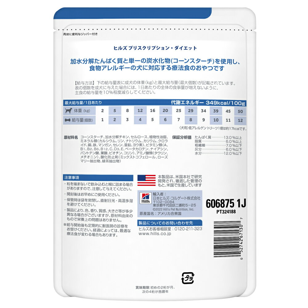 セットでの販売の商品になります。単品での返品は一切お受けしておりません。あらかじめご了承ください。〔製品の特長〕 ●食物アレルギーに配慮し、加水分解たんぱく質を使用 ●EPAを含むオメガ-3&6脂肪酸を配合し、皮膚・被毛の健康をサポート ●皮膚バリアの健康な機能をサポートするため、抗酸化成分を配合 〔ペットにとってのメリット〕 ●食物アレルギーに配慮し健康的な消化を助けます。 ●皮膚、被毛の健康に配慮し、皮膚バリア機能を維持します。 ●健康をサポートし、免疫力を維持します。 〔その他の情報〕 ●製品の酸化防止に自然派成分を使用しています。 ■素材・材質:コーンスターチ、加水分解チキン、セルロース、植物性油脂、ミネラル類(カルシウム、リン、ナトリウム、カリウム、クロライド、銅、鉄、マンガン、セレン、亜鉛、ヨウ素)、ビタミン類(A、B1、B2、B6、B12、C、D3、E、ベータカロテン、ナイアシン、パントテン酸、葉酸、ビオチン、コリン)、アミノ酸類(タウリン、メチオニン)、酸化防止剤(ミックストコフェロール、ローズマリー抽出物、緑茶抽出物) ■成分:【乾物量分析値(%)】たんぱく質17.7%、脂質11.5%、炭水化物(NFE)61.5%、粗繊維4.9%、カルシウム0.67%、カリウム0.61%、ナトリウム0.19%、マグネシウム0.056%、ビタミンC165ppm、ビタミンE805IU/kg、オメガ-3脂肪酸0.37%、オメガ-6脂肪酸3.19% ■代謝エネルギー:17kcal/1個 ■内容量:12個セット ■JANコード:0052742671307 ■原産国:アメリカ合衆国 ■メーカー:日本ヒルズコルゲート ■区分:ペット用品 ■広告文責:ペットゴー株式会社 0120-958-046 ■更新日時:2025/09/17 10:36:18 <免責事項>本サイトに掲載されている商品情報は、商品パッケージやカタログ、またはメーカーから提供された情報に基づくものであり、その内容について当社は責任を負いかねます。これらについてのお問い合わせはメーカーに直接行っていただきますようお願いいたします。また、メーカーによる仕様変更に伴い商品の表記と実際の仕様が異なる場合がございます。