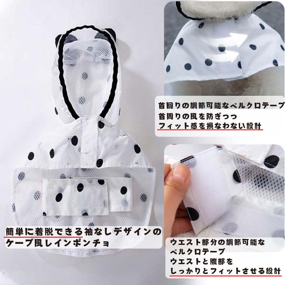用途犬服 犬用レインコート【雨の日も快適♪ 】ポンチョ風のデザインで、簡単に着せられるのが特徴です。雨の日でも快適なお散歩を楽しめる犬用カッパです。【こだわりの細部】首元にはリード穴があり、着せたままリードに繋げられます。リード穴にはカバーが付いており、雨の侵入を防ぎます。 首周りはベルクロで調節可能で、ペットの首を絞めつけません。 フードの前面は透明な素材なのでペットの視界を妨げません。【簡単お手入れ】防水素材で作られていて速乾性があるのでお手入れも簡単です。汚れた時は丸洗い可能です。カラー・サイズカラー・ホワイト サイズ・XS・S・M・L・XL・XXL推奨シーズン春・夏・秋・冬生地の厚さ・伸縮性・ボタン有無厚さ・薄手 伸縮性・無し マジックテープ推奨犬種パピー チワワ トイプードル ミニチュアダックス 柴犬 フレンチブルドッグ ポメラニアン ミニチュアシュナウザー マルチーズ ダックス ヨークシャーテリア パグ シーズー シェルティなどパピー,子犬,小型犬,中型犬※入荷ロットなどにより若干の差異がある場合がございます。 お使いのブラウザや設定などにより、実際の商品との色の違いが生じる場合がございます。 予告なく内容物などの仕様変更が生じる場合がございます。雨の日の愛犬の為のポンチョレインコート犬用レインコートレインコートのポイント雨の日を乗り切る犬の服(レインポンチョ)サイズ・カラー - Size ・Colorサイズ交換・初期不良についてサイズが合わなかった場合は交換対応等しっかりご対応致します。 購入履歴の問い合わせよりご連絡下さい。 ※交換時のこちらへの送料はご負担をお願い致します。 在庫状況によりご希望のサイズが無い場合はご注文をキャンセル対応等になる場合がございます。配送について - About deliveryレビューキャンペーン中!当店LINE公式に友だち登録でお得なクーポンプレゼント!他にもかわいい犬服がいっぱい♪