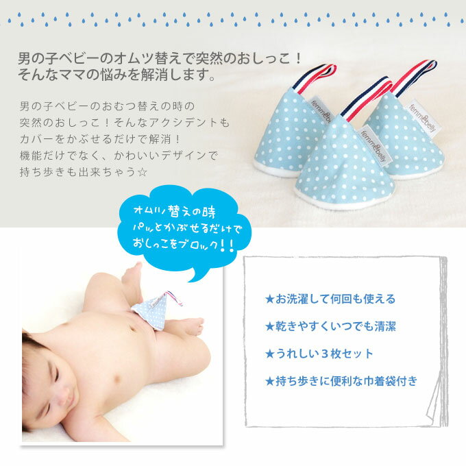 男の子のママなら、経験した人も多いはず・・・おむつ替えの時の突然のおしっこ!! そんな時、このカバーをかぶせるだけでおしっこをブロックできちゃいます☆ 機能だけでなく、可愛いデザインも◎ カバーは3枚組で巾着袋付きだから、お出かけにも便利♪ ギフト用ラッピングはこちら↓ ※こちらの商品はサイズが小さいボックスでのラッピングとなります為、お熨斗をお付けする事は出来かねます。何卒ご了承ください。