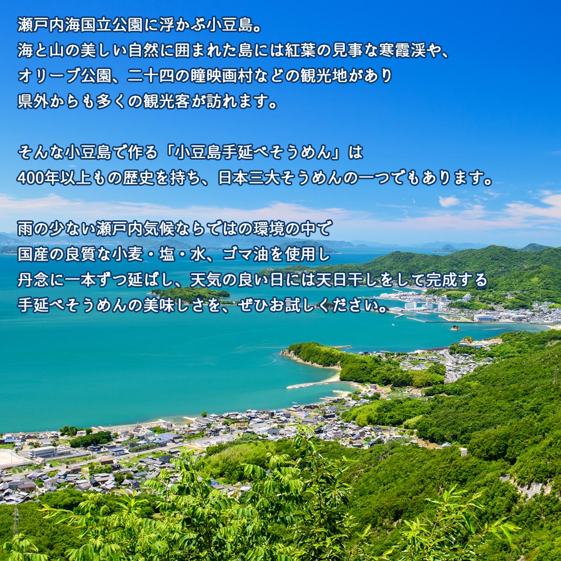 【小豆島手延べそうめん】 瀬戸内海国立公園に浮かぶ小豆島。海と山の美しい自然に囲まれた島には、紅葉の見事な寒霞渓やオリーブ公園、二十四の瞳映画村などの観光地があり、県外からも多くの観光客が訪れます。 そんな小豆島で作る「小豆島手延べそうめん」は、400年以上もの歴史を持ち、日本三大そうめんの一つでもあります! 雨の少ない穏やかな瀬戸内気候ならではの環境の中で、全て国産の良質な小麦・塩・水・ゴマ油を使用し、丹念に一本ずつ延ばし、天日干しをして完成する手延べそうめんの美味しさを、ぜひお楽しみください。 【本物の味を追求した手延べそうめん】 じっくりと時間をかけ一度乾燥させたそうめんに、加湿の工程をプラスすることによって、再び生めんに戻して半生に加工したのがこの手のべ半生そうめんです。 半生に加工するひと手間を、時間を惜しむことなくかけることにより、しっかりとしたコシの強さはそのままに、ツルツルッとした食感とまろやかな舌触りという、まさに贅沢を極めた食べ心地が実現。 半生独特の歯切れのよさも加わったおいしいそうめんになっています。 ■商品名:手のべ半生そうめん(めんつゆなし) ■原材料:小麦粉(国内製造)、食塩、ごま油 ■内容量:180g(約2人前)×24袋 ■賞味期間:120日 ■お届け状態:化粧箱 ■製造者:創麺屋(香川県小豆島町) ※こちらの商品はつゆは付属しておりません ※本品製造工場ではそばを含む製品を生産しています。 ※この商品は産地直送品です(製造工場からお客様に直送されます) ※お買上から発送までの期間:土日祝日等休業日を除き、1〜5営業日 ■代金引換はお受けできません 決済システム上では代金引換が選択できますが、こちらの商品にはご利用いただけません。 ■同梱および、ご注文につきまして こちらの商品は、送料無料にて契約農家から発送いたします。「産地直送品」になりますので、他商品との同梱発送はお受けできません。ご注文確認後に商品の手配を開始いたしますので、ご注文内容のご変更やキャンセルはお受けできませんので予めご了承くださいませ。 ■到着までの日数 発送後、中一日(青森県・岩手県・秋田県・宮城県・山形県・福島県・北海道・沖縄県)、その他の都道府県は翌日着予定。但し、離島・一部地域を除く。 [2408r] 小豆島手のべそうめんはこちらから おすすめ商品はこちら