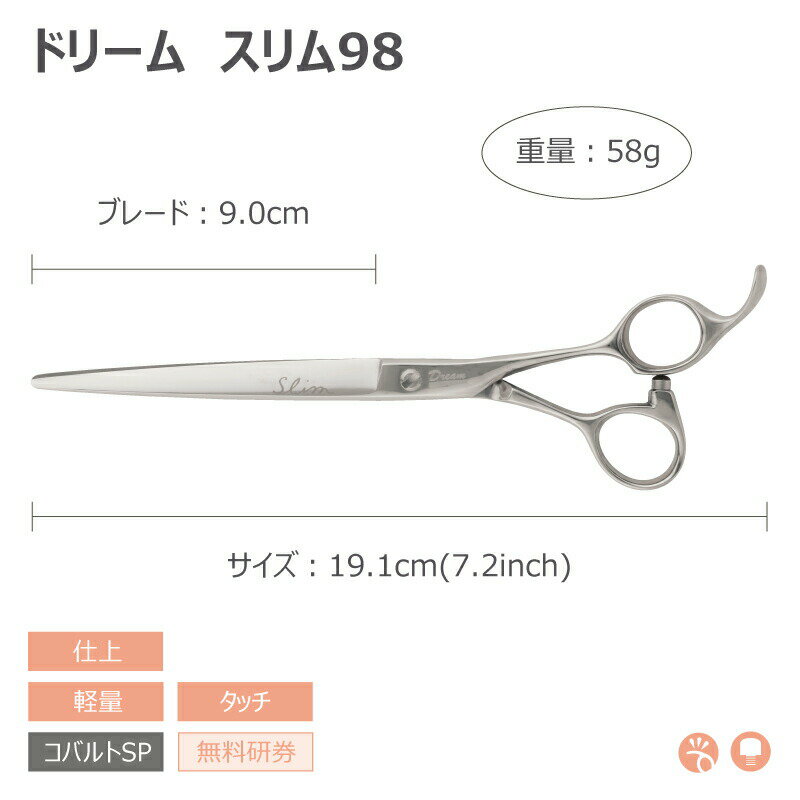 【送料無料】【プロ仕様】トリミングシザー ストレート ドリーム産業 スリム98 仕上げ 軽量 タッチ 無料研券付 ペット用 ハサミ