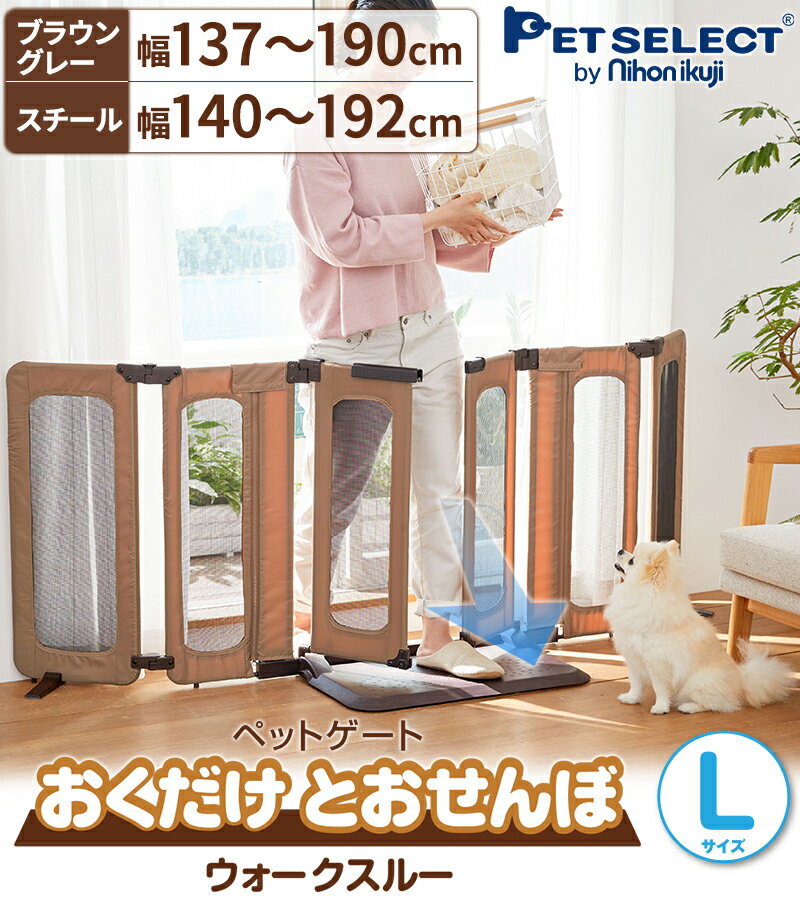 ●よく通る場所でも便利なドア付きのペットゲート ・手がふさがっていても、体を当てて開閉可能なので行き来がラクチンです。 ●置くだけだから持ち運んで使いたい場所で使える! ・前後両方のフレームを出してプレートをはめるだけ。使いたい場所におくだけでしっかり自立します。(工具不要) ・広げるのも畳むのも簡単だから、ワンちゃんのいる場所に一緒に持ち運んで使えます。 ●背面に敷居があっても大丈夫!スタンドフレームは片方でも使えます。 ・段差がある場所もピタッと寄せられます。片側のスタンドフレームだけで自立するから家中のいろいろな場所で活躍します。 ●ワンちゃん用の素材を使用 ・シニア犬のそばに置いても安心な柔らか素材のペットゲート。ベビーでも使われている安心素材+ペット用にメッシュ部分を強化しました。 ・隙間が少ないので足を挟みにくい安心設計です。 メーカー希望小売価格はメーカーカタログに基づいて掲載しています ※ご購入前にご確認ください※ご在宅の時間帯が限られる方は時間指定をお願いします。ご不在の場合再配達になりますが、時間帯が限られる事があります。北海道・沖縄・離島へのお届けについてご指定頂いた日時に配達できない可能性がございます。 沖縄・離島・北海道へは船便での配送となる場合がございます。 ※船便でのお届けの場合※ お届けまでの目安として、約1週間程 頂戴しております。 海上荒天や積載量規制、その他諸事情等により、 上記よりお時間を要する可能性がございます事を、あらかじめご了承下さい。玄関先などに荷物を置く【置き配】はお受けできません。※動画の商品は同シリーズ品「Sサイズ」です その他サイズバリエーション Sサイズ Mサイズ >販売ページはこちら< >販売ページはこちら< ※注意事項※商品の色調はお使いのパソコンの環境などによりまして、実物と多少異なる場合があります。※製品の仕様は改善等のため、予告なく変更する事があります。予めご了承ください 商品名 ペットゲート おくだけウォークスルーL 対象犬種 ●ブラウン・グレー:超小型・小型・中型犬 ●スチール:小型〜中型犬 取付幅 ●ブラウン・グレー:直列時:約190cm / コの字型:約137cm ●スチール:直列時:最大 約192cm / コの字型:約140cm サイズ(ブラウン・グレー) 直線使用:約 幅190x奥行き70x高さ76cmコの字型使用:約 幅137×奥行き70×高さ76cm 折りたたみ時:約 幅129.5×奥行き10×高さ76cm サイズ(スチール) 直線使用:約 幅192×奥行き70×高さ76cmコの字型使用:約 幅140×奥行き70×高さ76cm 折りたたみ時:約 奥行き10cm 重 量 ●ブラウン・グレー:9.6kg●スチール:12kg 素 材 パイプ:スチールセーフティプレート:ポリプロピレンネット※ブラウン・グレーのみ:ポリエステル、PVC(非フタル酸) セット内容 本体、セーフティプレート×2、サイドスタンド×2 販売元 日本育児 ペットセレクト 製造国 中国(デザイン:日本) 備考 扉を開けまま固定する「扉解放機能」はございません ご注意ください 室内用(屋外で使用しないでください)本製品を階段上や、段差の上近くには設置しないでください。 おすすめペットゲート 大型犬対応突っ張り式ゲート 最大422cmワイドな木製パーテーション >販売ページはこちら< >販売ページはこちら<