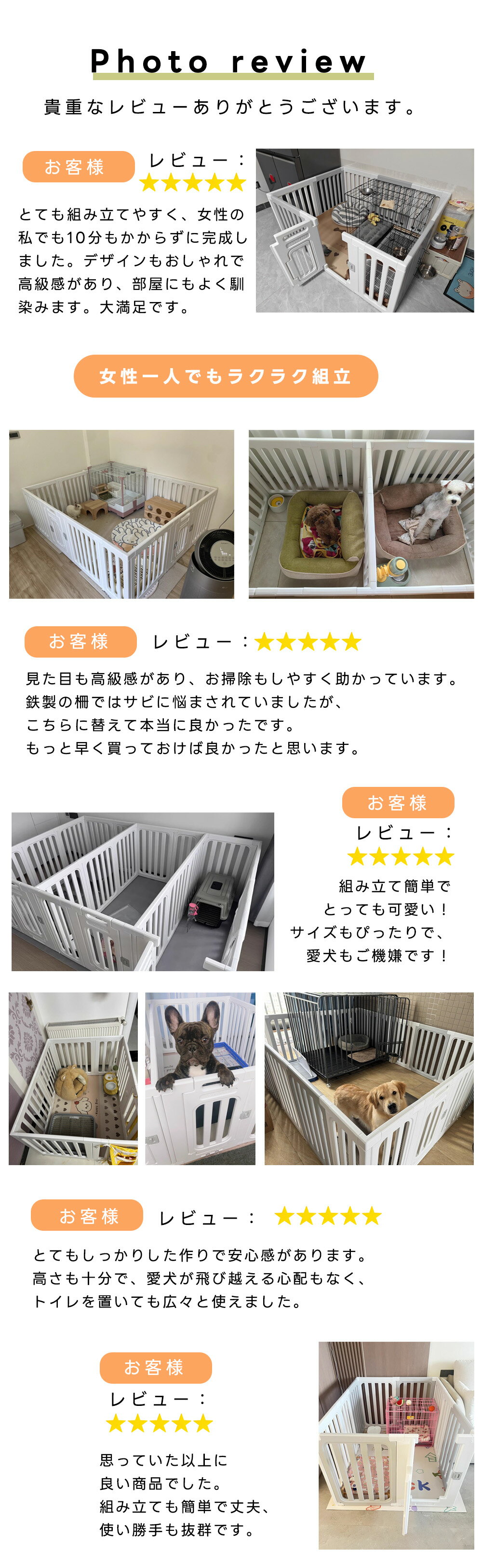 製品仕様 商品 ペットサークル 材質 高密度HDPE 高さ 60cm//75cm 柵の間隔 4cm/4.5cm パネル厚さ 約3cm 特徴 檻感がない 自由に組み合わせ ドアの位置は、自由に変更することができます。 商品サイズ セットA:幅53cm×奥行53cm (シングルルーム) セットB:幅103cm×奥行83cm (シングルルーム) セットC:幅103cm×奥行103cm (シングルルーム) セットD:幅133cm×奥行103cm (シングルルーム) セットE:幅153cm×奥行103cm (シングルルーム) セットF:幅183cm×奥行103cm (シングルルーム) セットG:幅203cm×奥行103cm (シングルルーム) セットH:幅233cm×奥行103cm (シングルルーム) セットI:幅203cm×奥行153cm (シングルルーム) セットJ:幅233cm×奥行153cm (シングルルーム) セットK:幅166cm×奥行83cm (ダブルルーム) セットL:幅206cm×奥行83cm ( (ダブルルーム) セットM:幅206cm×奥行103cm (ダブルルーム) セットN:幅236cm×奥行103cm (ダブルルーム) セットO:幅256cm×奥行153cm (ダブルルーム) ※測る位置により±2~3cm程度の誤差が生じる場合がございます。 セット内容 サークル本体、コネクタ、日本語取扱説明書 商品説明 【檻感がない】 ・このサークルケージの最大の特徴は、檻感がなく、視線を遮ることなくペットを一目で見ることができる点です。 ・これにより、ペットとのコミュニケーションがスムーズに行え、ペットも飼い主の存在を感じやすくなります。 【耐久性・安全性・便利性】 ・高密度HDPE素材を使用しており、耐久性と安全性を兼ね備えています。 ・ドア付きの設計により、ペットの出入りがスムーズで、飼い主様の手間を省きます。 ・ペットサークルの外側ロックはスマートペットが誤って開いたり逃げたりするのを防ぎ、出入りが簡単です。 【乗り越えを防ぐ高さ・柵の間からのすり抜けを防止】 ・ 高さ60cm/75cmのオプションがあり、小型犬から中型犬までの脱走防止に効果的です。 ・柵間隔約4cm/4.5cmで子犬のすり抜けを防ぎます。 【変形可能なデザイン】 ・室内は任意の形状に調整でき、長方形、正方形などに変更して、さまざまなスペースに適応できます。 ・自由に組み合わせ可能なパネルは、小型犬から中型犬までのサイズに対応し、ペットの成長や活動量に合わせて最適な空間を作ることができます。 【組み立て簡単】 ・軽量パネルをコネクタで接続するだけで工具不要、女性でも短時間で設置が完了できます。 ・すべての角は丸みを帯びており、通行人やペットに危害を与えません。 【注意事項】 ● 海外からの輸入品のため梱包のダンボールに汚れや若干破れがある場合がございます。 ● 通関の際、中身の確認のため段ボールを一度開けられた商品がある場合がございます。 ● 商品がダンボールギリギリに入っておりますので、開梱の際カッター等をご使用される場合は商品を傷つけないようにお気をつけ下さい。 ●生産工程上パネルに小さな黒い点やプラスチックのカスが生じる場合があります。 返品交換対象外になりますので予めご了承ください。 【検索用キーワード】 ペットサークル 犬 ゲージ 大型犬 ゲージ ペットサークル 折りたたみペットサークル 透明 ペットサークル 中型犬 ペットサークル 大型犬 ペットサークル 屋内 ペットサークル 犬 フェンス 室内 ハウス 犬用サークル 犬 サークル 広い ペットサークル 拡張 ペットサークル トレー ペットサークル ドア付き ペットケージ ゲージ 犬 サークル 広い 室内用 犬用 犬 サークル ペットフェンス 中型犬 組み立て おしゃれ 犬 ゲージ ケージ 大きいサイズ 安全 犬 棚 扉 お洒落 ドッグサークル 連結 室内 小型犬 中型犬 多頭飼い 安全柵 ペットケージ 犬ケージ 犬サークル ダブルロック シンプル ペットサークル ドア付き ペットフェンス 高さ60cm 75cm ペットケージ ドッグフェンス 高密度HDPE素材 犬 サークル ドッグサークル 広い 室内用 犬用 大型犬 犬 サークル 安全 棚 扉 組み立て方自由 おしゃれケージ 大きいサイズ イヌイペット 犬 ケージ ゲージ ペットゲージ ペットケージ ペットサークル ドッグケージ ドッグゲージ 折りたたみ 折り畳み 犬用ケージ 犬用ゲージ 犬用 ハウス サークル 犬小屋 広い おしゃれ おすすめ 室内 屋内 室内飼い 猫 キャット 犬のケージ 犬のゲージ ペットフェンス ベビーゲート ベビーサークル ベビーガード ベビーフェンス ペットガード 置くだけ 扉付き ドア付き パネル ペット 室内用 柵 サークル いぬ イヌ わんちゃん 幼犬 小型犬 脱走防止 侵入防止 家具調 ドア付き 通せんぼ しつけ トイレ 留守番 チワワ ブルドッグ フレンチブルドッグ フレブル パグ ブヒ トイプードル トイプー ヨークシャーテリア ポメラニアン ヨークシャテリア ヨーキー シーズー ミニチュア シュナウザー マルチーズ ピンシャー キャバリア ビジョンフリーゼ ペキニーズ ミニチュアダックス ダックス パピヨン 柴犬 秋田犬 メーカー希望小売価格はメーカー商品タグに基づいて掲載しています