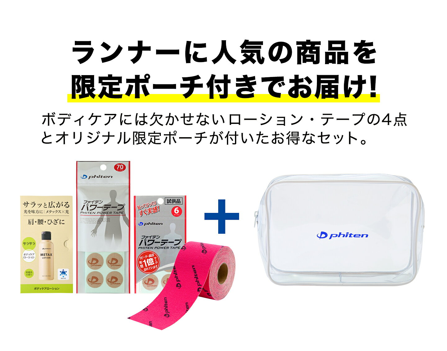 ランナーを応援するお得な特別セット。 人気の『チタンテープ 伸縮タイプ スポーツ』と『パワーテープ』『メタックスローション』を、このセット限定の非売品ポーチと一緒にお届け!■セット内容 ・ポーチ(縦 約12.5cm×横 約18cm×奥行 約5.7cm)・パワーテープ 70マーク・パワーテープ 6マーク・メタックスローションb 1.5ml(サンプルパウチ)・チタンテープX30 伸縮タイプ スポーツ ■カラー チタンテープX30 伸縮タイプ スポーツ:ピンク(ロゴ入り)、イエロー(ロゴ入り)、ターコイズ(ロゴ入り) ■素材 ポーチ:塩化ビニール ■備考