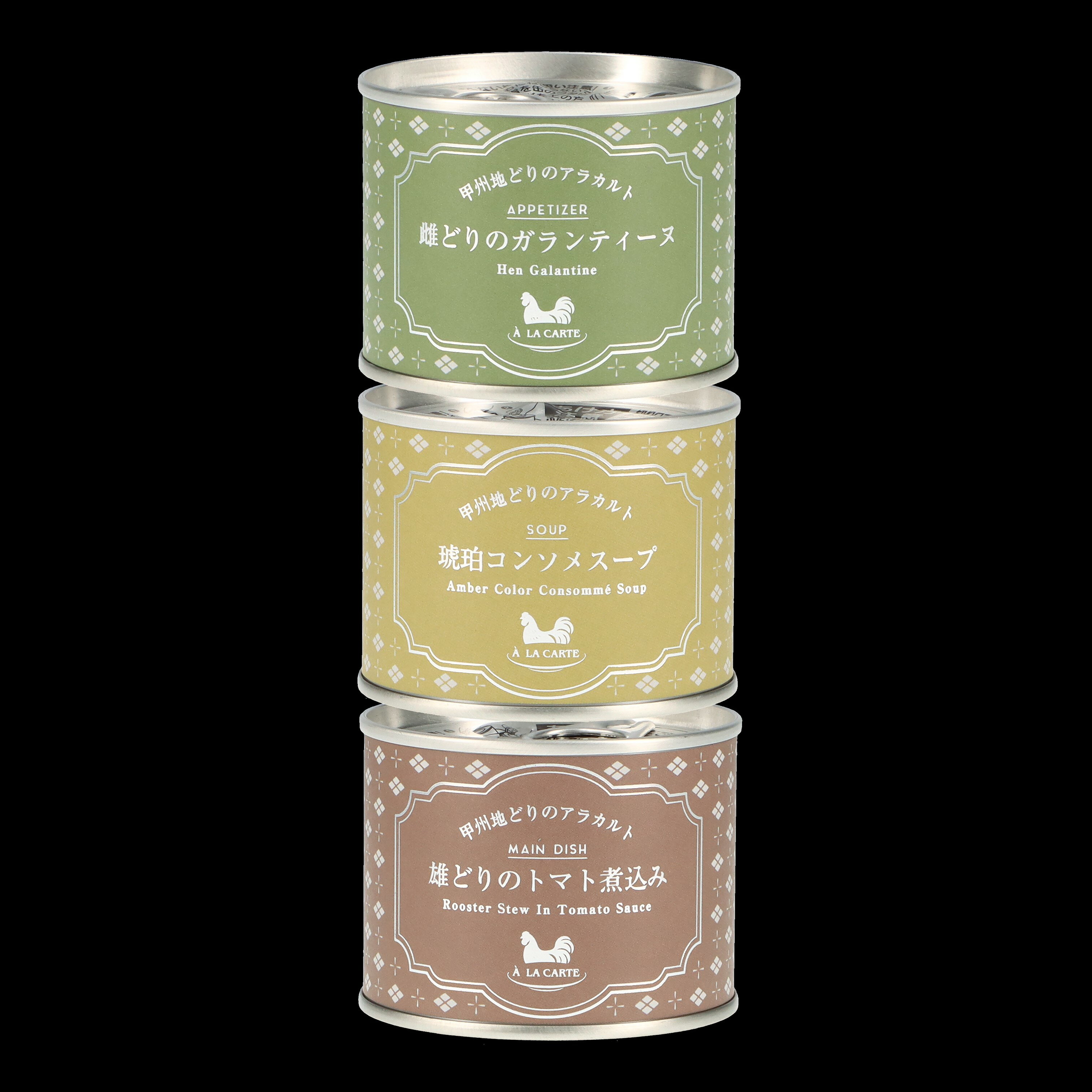 缶詰のコンセプトは、甲州地どりを使ったコース料理を、手間をかけることなく堪能してもらうことです。ラインナップは、「雌どりのガランティーヌ」、「黄金コンソメスープ」、「甲州地どりのトマト煮込み」 の3種。缶を開けてお皿に盛り付けるだけで、前菜・スープ・メインディッシュを食卓に並べることができます。 山梨の逸品を様々なシーンでご利用ください。 【季節の贈り物に】 お年賀・迎春・お正月・年末年始・バレンタイン・ホワイトデー・卒業式・卒園式・入学式・入園式・母の日・父の日・御中元・お中元・暑中御見舞・残暑御見舞・夏ギフト・秋ギフト・敬老の日・ハロウィン・クリスマス・冬ギフト・お歳暮・御歳暮 【ちょっとした手土産・プレゼントに】 御祝・御礼・謝礼・御挨拶・粗品・お使い物・贈答品・ギフト・プレゼント・お土産・手土産・贈りもの・進物・お返し 【お祝い・お返しの品に】 引き出物・お祝い・内祝・結婚祝・結婚内祝・出産祝・出産内祝・引き菓子・快気祝・快気内祝・プチギフト・誕生日・結婚引出物・七五三・卒業祝い・卒園祝い・入学祝い・入園祝い・進学内祝・入学内祝・寿・開店祝・開業祝・新築祝 【長寿・結婚記念日のお祝いに】 還暦祝・古希祝・喜寿祝・米寿祝・白寿祝・銀婚式・金婚式 【年忌法要など仏事の品に】 御霊前・御仏前・お盆・新盆・初盆・お彼岸・法事・法要・仏事・弔事・志・粗供養・満中陰志・御供・御供物・お供え・お悔やみ・命日・月命日・葬儀・仏壇・お墓参り・香典返し 【その他】 帰省 買い忘れ ご挨拶 旅行 バスツアー 工場見学 の思い出 におすすめ 人気 (検索用キーワード:富士の国やまなし 特産品モール 山梨県 道の駅 名産 お土産 ご当地名物 定番 日持ち 食べ物 ランキング おしゃれ オススメ B級グルメ 富士山 Mt.Fuji 世界遺産 甲府 富士吉田 都留 山梨 大月 韮崎 南アルプス 北杜 甲斐 笛吹 上野原 甲州 中央 西八代郡 市川三郷 南巨摩郡 早川 身延 南部 富士川 中巨摩郡 昭和 南都留郡 道志 西桂 忍野 山中湖 鳴沢 富士河口湖 河口湖 北都留郡 小菅 丹波山 公式サイト アンテナショップ )