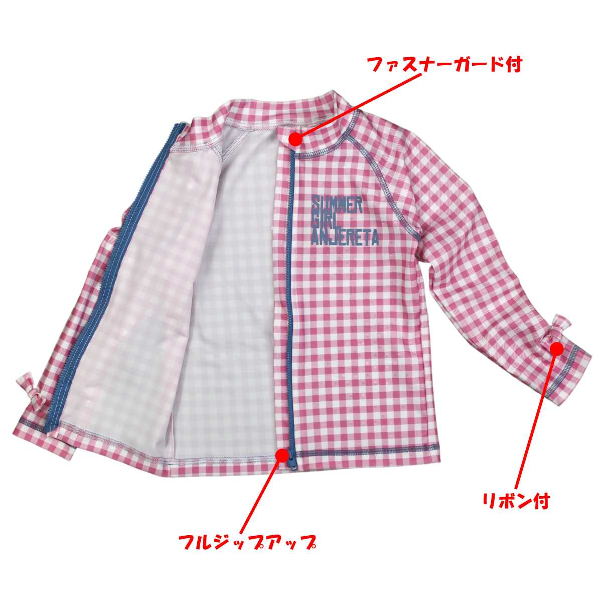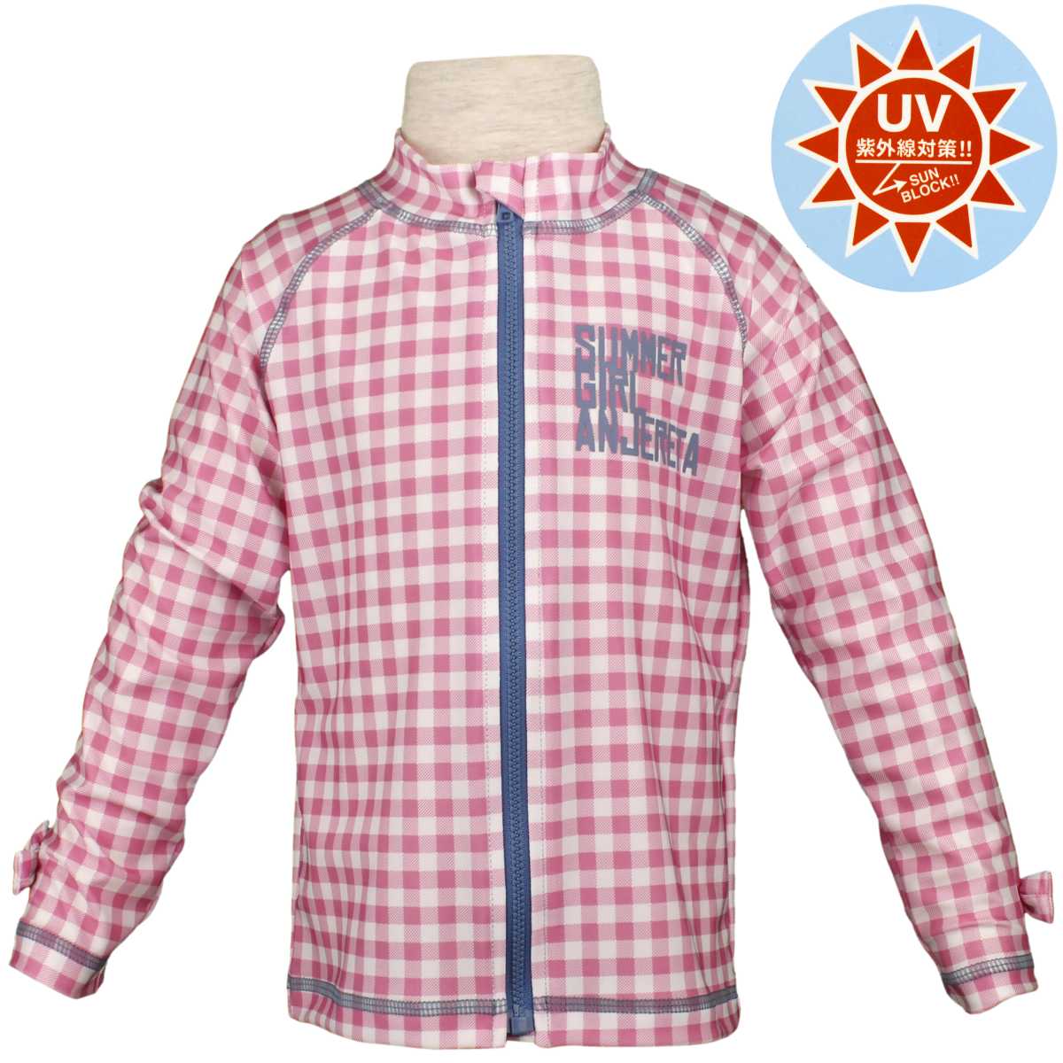 バリエーション ###オプションリスト### 関連キーワード ###KEYWORD###ガールズ・キッズ・水着[Anjereta]長袖ラッシュガード・フルジップアップ・チェック柄・UV(紫外線) 日焼け防止・女児・ガールズ○ 配送料金※ この商品は配送方法を「追跡可能メール便」でのご注文のみ送料無料となります。※ 配送方法は日本郵便ゆうパケットとなります。※ 配送方法ご変更は、カート画面最後の「注文確認画面」で変更可能です。※ 代金引換の場合は、宅配便送料が発生いたします。※ 送料無料商品以外との同梱の場合は、別途送料が発生し250円分が減額されます。 送料以上は減額になりません。※ 発送完了後のキャンセルやご返品の場合、ゆうパケット送料分(250円)がご請求となります。○ 代引きで注文の場合 ・代引きで注文の場合、宅配便料金が適用となります。 ・代引きで注文の場合、追跡可能メール便(送料無料)はご利用頂けません。 ・カート画面内で自動計算されないため、ご注文後に送料修正を行い確認メールを配信致します。 ・宅配便料金からゆうメール送料無料分(250円)を減算した送料がご請求となります。 ・代引き手数料400円が加算となります。○ 商品情報ガールキッズ・UV・チェック柄・長袖ラッシュガード ・ UVプロテクト ・ サンブロック-紫外線からお子様のお肌を守ります ・ チェック柄 ・ フルZIP(ファスナーガード付) ・ 左胸に英字ロゴプリント入り ・ 袖リボンつき ※ 同柄の水着(845582)あり(別売り) ※ベビーサイズ(845553)あり(別売り)○ ラッシュガードとは ・ 日焼け防止(紫外線防止)、スリ傷防止、キズ隠し用など幅広く愛用されております。 ・ スキーウェア、スノーボードウェアのスポーツインナーや保温ウェアとしても活用いただけます。 ・ 釣り用のウェア(アンダーシャツ・保温ウェア)としても活用されています。 ・ 前面フルジップでファスナーガード(ファスナーを締め切った部分をカバーして肌の挟み込みを防止)付。 ・ ファスナーガード付(ファスナー内側に当て布付で肌を巻き込みにくい。)○ 素材情報ポリエステル84%ポリウレタン16%○ 関連商品###関連商品###○ その他情報###その他情報###○ サイズ詳細サイズ着丈胸囲ラグラン袖丈110cm38cm53〜59cm43cm120cm41cm57〜63cm48cm130cm44cm61〜67cm53cm ・ 平置きで採寸したものです。 ・ 水着素材ですので伸縮性があります。