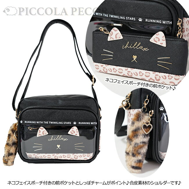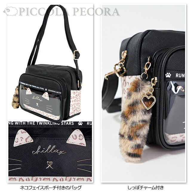 ショルダー 子供 キッズ 女の子 ネコ フェイス ヒョウ柄 ポーチ 合皮 しっぽ チャーム 付き バッグ Coboca+ コボカ / 小学生 ティーン ジュニア 抗菌 可愛い