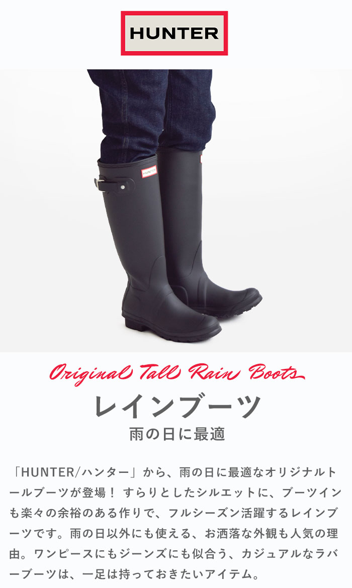 メーカー希望小売価格はメーカー商品タグに基づいて掲載しています ▲クリックで拡大します▼▼NEW ARRIVALS▼▼ ▼▼Champion特集▼▼ ▼▼SUBU新作・新色▼▼ →合わせてるボトムスをチェック 4 5 6 23.0cm 24.0cm 25.0cm 商品説明 雨の日に最適なこのオリジナルトールブーツは、1956年に初めて登場して以来ハンターオリジナルブランドを代表するアイテムです。天然ラバーを使用した28個のパーツをハンター特注のアルミニウムの型を用いて3日間かけて手作業で組み立て、優れた保護力を発揮するため加硫します。ハンターオリジナルのトレッドパターンと快適なポリエステルの裏地が特徴です。このハンターグリーンの防水ブーツはタイムレスな雨の日の必需品です。 肌をゴムとの接触から保護するために、すべてのハンターブーツは靴下と一緒に着用することをお勧めします。ハンターブーツソックスは、ハンターブーツと着用するために特別に設計されています。ゴムやナイロンのブーツの端を覆うように折り返すデザインで、靴擦れを防いでくれます。 モデル コンバース23cm 着用サイズ ブラック:4サイズ ネイビー:5サイズ 素材 表地:100% ゴム製 裏地:100% ポリエステル製 バックル: 100% メタル 注意点 画像・サイズはサンプルのものです。仕様が多少異なることがございます。ご利用のパソコンのモニターによってカラーの見え方が違ったり、実際の商品と色味が多少異なって見える場合がございます。ご了承ください。 店頭同時販売のため売り切れの場合がございます。ご了承ください。 サイズにつきましては多少の誤差がでる場合がございますのでご了承ください。 HUNTER/ハンター 1956年にアメリカ人実業家ヘンリー・リー・ノリスがスコットランド、エジンバラに工場を構え、ゴム製ブーツメーカーとして株式会社ノースブリティッシュ・ラバーカンパニーを発足。1977年にエジンバラ公から、続く1986年には女王陛下によって最高品質の証しでもある英国王室のワラントを与えられ、既に30年以上も英国王室の御用達ブーツとされている。