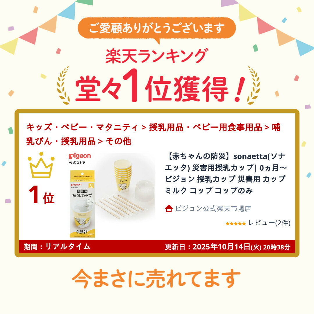 \商品の感想(1行)を書くだけ!/ レビューを書いて次回使えるクーポンプレゼント ▼詳しくはこちら▼ 【商品紹介】赤ちゃんの防災-sonaetta-どんなときでも、赤ちゃんの笑顔を守りたい。そのために大切なのは、日常の子育てのなかで自然にソナエができていること。ソナエッタは、そんなママやパパの思いをカタチにしました。<sonaetta 災害用授乳カップの特徴>●水が十分に使えない災害時にも使用可能・使いきり、洗浄・消毒不要で衛生的・目盛付きのマドラーで、粉ミルクの調乳が可能●紙コップ授乳をより容易に・フタを付け、ミルクを内側に一旦溜める場所を作ったことで少量の流量調整が可能●通常の哺乳に戻りやすい・咥えさせず、お口に少量ずつ与える飲ませ方なので、直母授乳などに戻った時に嫌がりにくい【素材・成分・原材料名】●カップ紙・内面加工:ポリエチレンラミネート加工(耐熱温度100℃)●フタ:ポリプロピレン(耐熱温度80℃)●マドラー:木(耐熱温度100℃)【ご注意】●この製品で寝かしたままの姿勢での授乳はやめましょう。●誤嚥の危険があるため、口の中へミルクを流し込まないでください。少量ずつ口の中に与えましょう。●飲みはじめは、カップを傾けすぎないでください。●授乳時間は30分までとして1回当たりの授乳量だけではなく、1日あたりの授乳量を確認しましょう。●赤ちゃんの様子をみながら、赤ちゃんのペースに合わせて時々げっぷさせましょう。●調乳後、マドラーをカップにさした状態で放置しないでください。●マドラーを調乳時のかくはん及びミルク量・ミルク温度の確認以外に使用しないでください。【取扱上の注意】●開封後は1週間を目安に使い切ってください。●火や熱源のそばにおかないでください。変形及び発火の恐れがあります。●授乳は保護者が行ってください。●変形、破損の原因となりますので強い衝撃を与えないでください。●亀裂、変形がある場合は使用しないでください。●調乳方法は、粉ミルクの取扱説明書にしたがってください。●中身が飛び出ないように、激しく振ったり強く押したりしないでください。●使用後の処分方法は各自治体の廃棄処分方法にしたがってください。●完全密封の商品ではございません。●電子レンジは使用しないでください。ポリエチレンラミネートが溶けたり、紙が焦げる事がございます。●一度使用したカップ及びフタは廃棄し、繰り返して使用しないでください。●フタの縁で指を切らないよう注意してください。●フタを他のカップに装着して使用しないでください。【ヤケド注意】注意:ヤケドの原因になりますので、下記の点にご注意ください。●調乳時は紙コップも熱くなります。●お子様のそばで調乳することはおやめください。●ミルクや飲み物の温度を必ず確認してから授乳してください。