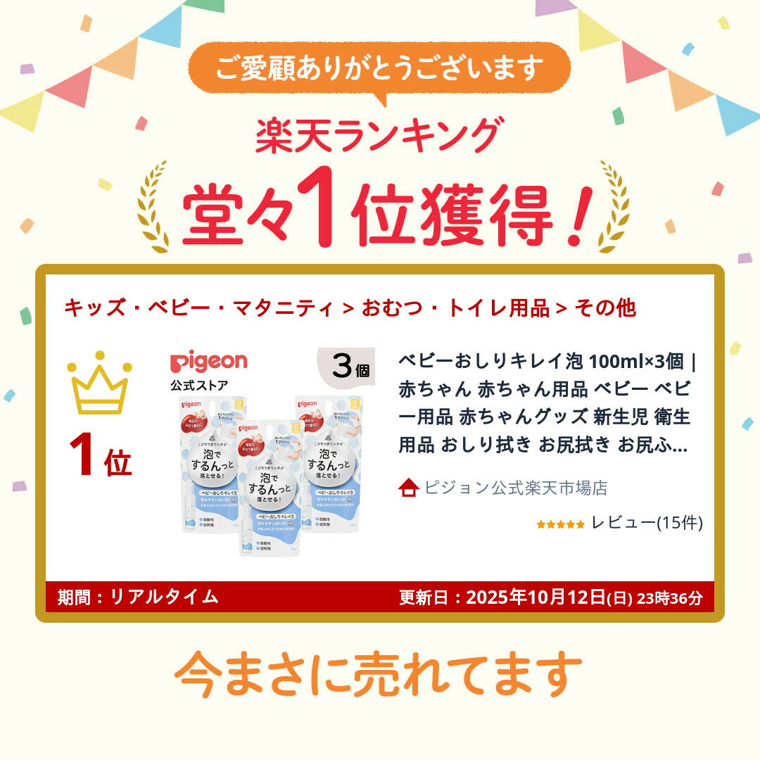 メーカー希望小売価格はメーカーサイトに基づいて掲載しています \商品の感想(1行)を書くだけ!/ レビューを書いて次回使えるクーポンプレゼント ▼詳しくはこちら▼ 【お得な3個入り】おしりナップに1プッシュ!荒れやすいおしりに♪●ベビーオイル入りの泡がなじんで、こびりつきうんちがするんっと落とせる!●うんちのときにいつもより少ない枚数で拭ける!●おしりの肌荒れを防ぐ2つの植物由来成分配合※。※オトギリソウ花/葉/茎エキス、メマツヨイグサ種子エキス(保湿成分)●新生児からお使いいただけます。●弱酸性・低刺激・無添加(パラベン、アルコール、着色料、香料)。●皮フ科医による皮フ刺激性テスト済み。(すべての方に肌トラブルが起きないというわけではありません)●0ヵ月頃から。【ご使用方法】おしりふき※ に500円玉大の泡をとります。おしりをやさしく拭いてください。お肌に泡が多少残っても問題ありません。※おしりふきには「ピジョンおしりナップシリーズ」をご使用ください。【成分】水、DPG、ポリソルベート80、パルミチン酸エチルヘキシル、BG、ヒアルロン酸Na、グリチルリチン酸2K、オトギリソウ花/葉/茎エキス、メマツヨイグサ種子エキス、ココアンホ酢酸Na、ラウリン酸、ポリクオタニウム-39、クエン酸、クエン酸Na、エチルヘキシルグリセリン、フェノキシエタノール、塩化Na、安息香酸Na【使用上の注意】●肌に異常が生じていないか、よく注意して使用する。●使用中、又は使用した肌に直射日光があたって、赤み・はれ・かゆみ・刺激・色抜け(白斑等)や黒ずみ等の異常が現れた場合は、使用を中止し、皮フ科専門医などへ相談する。そのまま使用を続けると症状が悪化することがある。●傷やはれもの、湿しん等異常のある部位には使用しない。●目に入ったときは、すぐにきれいな水で洗い流す。●持ち運びの際はキャップの閉まりに十分注意する。使用後はしっかりキャップを閉める。