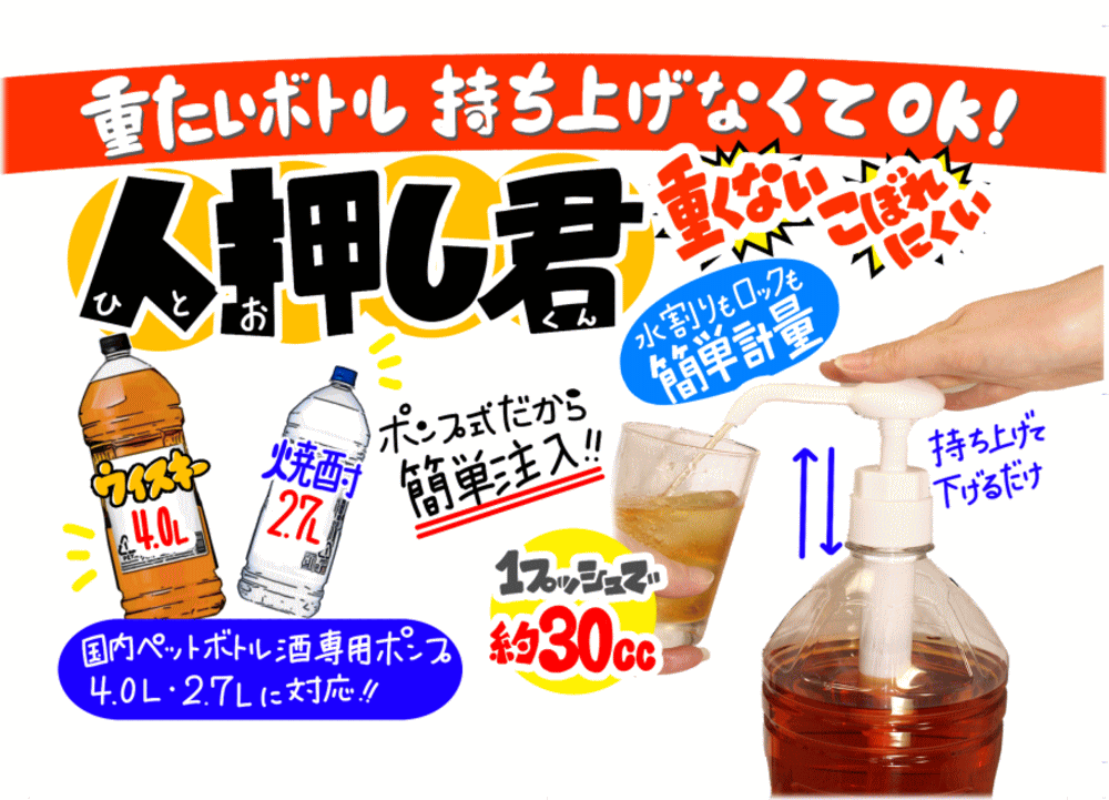 商品情報商品名人押し君材質本体:ポリプロピレン チューブ:ポリエチレンサイズ本体:W100×D44×H262mm付属チューブ長:・ロング約255mm・ショート約205mm現品重量67g原産国中国使い方1.人押し君本体とボトルサイズに適合したチューブをつなぎます。2.組み立てが終わりましたら使用の前に、水又はぬるま湯にて洗浄して下さい。(洗浄の際、洗剤は使用しないで下さい。)3.ペットボトルに差込み、コンテナーキャップ(取付)にて固定します。その際、コンテナーキャップを確実に閉める為にボトルの口(ネジ部)に残っているTE バンド(いたずら防止バンド)を取り外して下さい。4.輸送の為ノズルが固定されておりますので、コンテナーキャップ及びボトルをしっかり固定しノズルのみを左に回しノズルをフリーな状態にして下さい。5.ゆっくりとノズルを上限まで引き上げて下さい、その後下限迄押し下げる事により一度に約 30ccが出て来ます。注意点・初回使用時には、水又はぬるま湯にて洗浄後、消毒薬(アルコール等)にて殺菌願います。・使い始めは中身が出るまで2〜3回ポンプを作動して下さい。・ノズルを上下させる際には、ボトルをしっかり固定してボトルに対して垂直に作動させて下さい。(斜めに力を掛けると動作不良を起こす原因となります)・ノズル部分を持って持ち上げないで下さい。液の重量でノズルが抜ける事が有ります。・勢いよくノズルを押すと液が飛び散る事が有ります。・ボトルが倒れると液流れするので御注意下さい。・落下させると破損・故障の原因に成ります。・5°C~40°Cの間での使用・保管を御願い致します。(決して熱湯で洗わないで下さい)・食器洗浄機・熱湯・漂白剤研磨剤等を使っての洗浄はしないで下さい。・火気に近づけないで下さい。・本品は保存用ではございません。使用後は取り外し洗浄して別に保管して下さい。・取り外しの際に、ポンプ及びチュープ内に多少の液が残りますので御注意願います。・この製品は消耗品です、御使用中に異常を感じられましたら、新品と交換願います。・本品を装着した状態で、長期保存しないで下さい。中身の風味が損なわれる恐れがございます。人押し君 ワンプッシュ 定量 ディスペンサー ひとおしくん 2.7L 4L ボトル対応 ロング ショート チューブ付き 家飲み 宅飲み 晩酌 BBQ バーベキュー 呑み 計量 居酒屋 業務 重たいボトルを持ち上げずにワンプッシュ!宅飲みやバーベキューで必須の人押し君 5