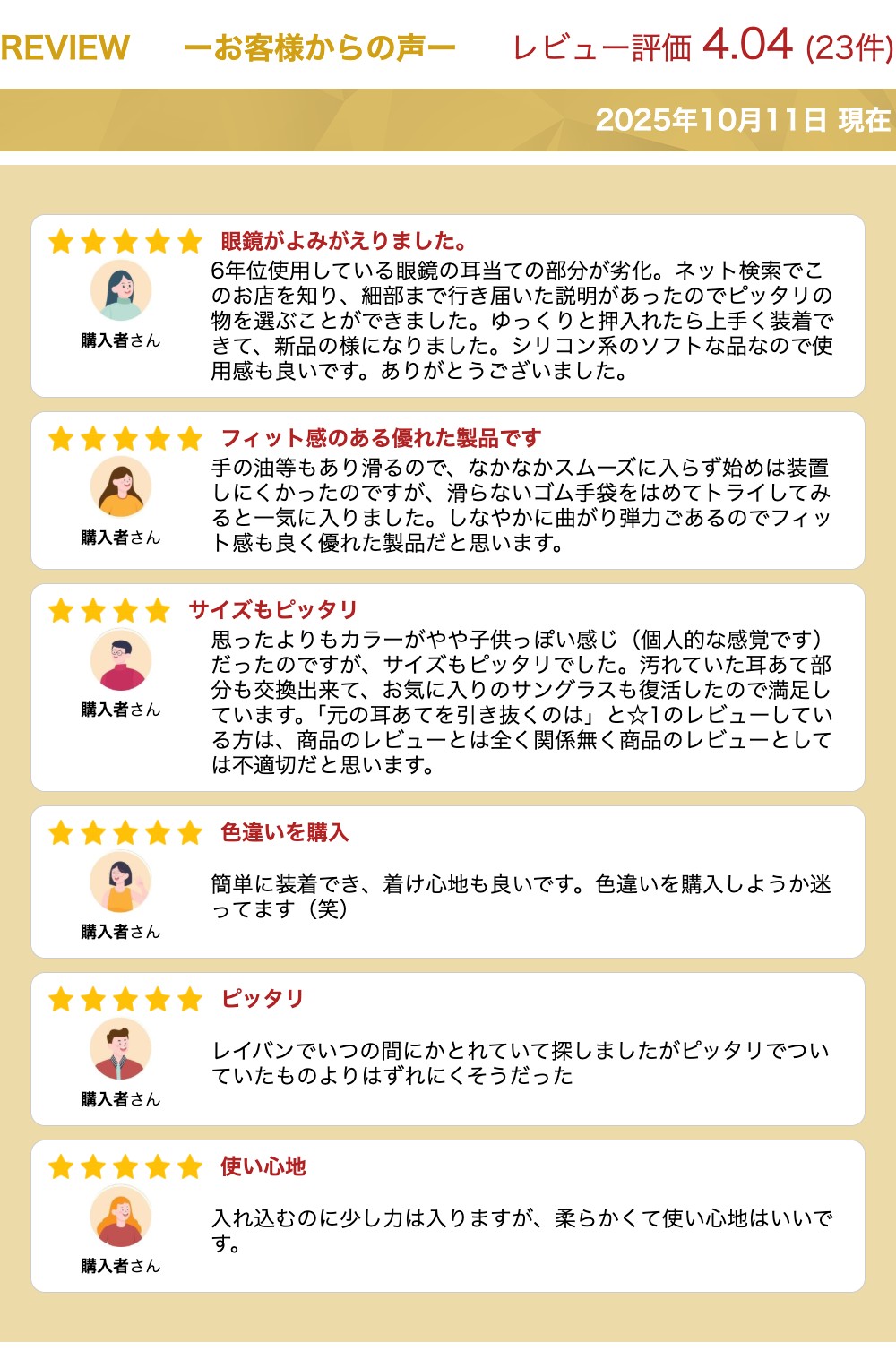 メーカーサンニシムラスペック素材:エラストマー 製造国:日本対応サイズ取付小口径:1.3mm〜1.5mm 丸芯・平芯とも対応特長【安全性】 ソフレモダンは日本製の高品質。アレルギーや肌荒れに配慮された商品です。肌に優しい素材が使われており、アレルギーの原因となる可塑剤を一切使用していません。ソフトでしっとりとした肌触りなので、長時間の着用でも快適に過ごせます。敏感肌の方やアレルギーを起こしやすい方にオススメです。 【耐久性】 耐久性にも優れています。耐油性や耐薬品性が高いため、脂性の方や化粧をしている方が使っても変質や劣化がしにくく、日常使いに最適です。さらに、曲げ耐性も高く、クラックや割れが入りにくい丈夫です。長期間にわたって安心して使用できる耐久性の高さが特徴です。 【スマートな見た目】 快適な掛け心地とおしゃれなデザインを両立させています。従来の耳当ての上から被せるタイプの商品では、見た目が損なわれることが多いですが、ソフレモダンはそのような心配がありません。シンプルでスマートな見た目を保ちながらも、耳にしっかりフィットし、快適な装着感を提供します。外見を気にせず、機能性とデザイン性を両立したい方にぴったりです。 【取り付け対応】 ソフレモダンは、1.3mmから1.5mmの小口径のテンプルに取り付け可能です。丸芯、平芯の両方に対応しているため、多くのメガネフレームに使用できます。テンプルの形状に合わせて柔軟に対応できるので、ほとんどのメガネフレームでお使いいただけます。注意事項モニターの発色具合によって実際の商品と色味が異なる場合がございます。 関連商品ソフレモダン 平芯用 大きめ メガネ 耳 クッション 耳当て 先セル ...一山用パッド イチヤマフレーム用 一山パッド ニギリツブ 141-73...ササマタ メガネ 鼻パッド 跡がつかない メガネ鼻パッド ぱふっと 鼻...1,320円1,320円1,300円サンニシムラ FrogPad フロッグパッド ツインパット 鼻パッド ...株式会社パール メガネ 鼻パット チタンパッド チタン メタルパッド ...メガネ 鼻パッド 高級 ナノセラミックパッド メガネ用 1PA 鼻当て...1,200円1,400円1,320円ぱふせる 1PA メガネ 耳当て クッション 先セル モダン メガネケ...SWANS スワンズ スポーツバンド メガネストラップ メガネバンドメ...東レ トレシー メガネ拭き くもり止め メガネ 曇り止め 繰り返し使え...1,100円1,320円1,320円\1000円ぽっきり/ サンニシムラ 眼鏡 鼻パッド 鼻あて 鼻パット...サンニシムラ メガネ 鼻パット 跡がつかない 2PA(4個) クッショ...メガネグリップ M L メガネ 耳 クッション メガネのずり落ち防止 ...1,000円880円660円メガネの耳当てクッション[安全性] 安心の日本製です。ソフトでしっとりとした肌触りで、アレルギーや肌荒れの原因のひとつである可塑剤を使用しておりません。アレルギーを起こしやすい方におすすめな、肌に優しいモダンです。 [耐久性] 耐油、耐薬品性が高いので、脂性の方、化粧をする方が使っても変質劣化しにくい。曲げ耐性も高く、非常に丈夫。クラックや割れが入ったりしにくい。 【スマートな見た目】 元から付いている耳当ての上から被せるタイプの商品ですと、どうしても見た目が損なわれてしまいます。一方、ソフレモダンはおしゃれなルックスを保ちつつも、快適な掛け心地をお楽しみいただけます。耳が痛くなりにくい対応サイズ元から付いている耳当ての上から被せるタイプの商品ですと、どうしても見た目が損なわれてしまいます。一方、ソフレモダンはおしゃれなルックスを保ちつつも、快適な掛け心地をお楽しみいただけます。 取付小口径:1.3mm〜1.5mm 丸芯・平芯とも対応 「丸芯」は、テンプルの芯の断面が丸いタイプのことで、「平芯」は、テンプルの芯の断面が平たいタイプのことです。ピンク&ブラウンブルー&ブラックベージュ 関連商品はこちら