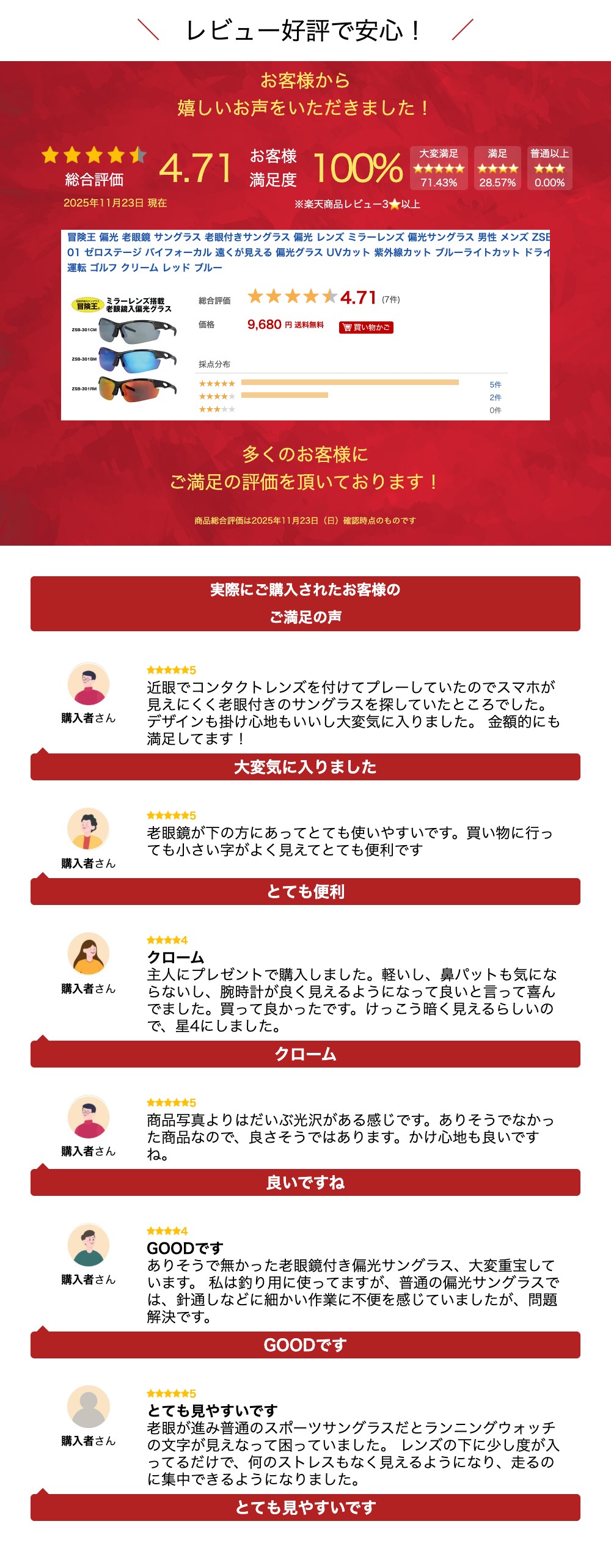 メーカー視泉堂ブランド冒険王シリーズゼロステージ バイフォーカル MR特徴人気の冒険王 サングラスから老眼レンズ入りモデルが登場。 掛け心地、見え心地ともに良好。 遠くと近くのどちらも見たいシーンに最適です。 世界基準品質テスト合格品・老眼鏡入りポリカーボネート偏光レンズ搭載 境目の目立たない老眼鏡入り偏光レンズと反射防止コート(ARコート)との組み合わせにより、 格段の視界の良さを確保可能となりました。 デザインもスポーティなタイプとなり、シニアユーザーには手放せないアイテムです。機能偏光サングラス 老眼鏡入り ミラーレンズ度数+1.5 +2.0 +2.5サイズZSB-301 レンズ幅(片目):62mm 鼻幅:16mm 耳かけ長さ:128mmカラーZSB-301CM フレーム:パールブラック/ブラック レンズ:クロームミラー ZSB-301RM フレーム:パールブラック/ブラック レンズ:レッドREVOミラー ZSB-301BM フレーム:パールブラック/ブラック レンズ:ブルーREVOミラー偏光度99%以上紫外線カット率99%以上製造国台湾注意事項モニターの発色具合によって実際の商品と色味が異なる場合がございます。関連ワードサングラス老眼鏡 老眼鏡サングラス 老眼サングラス バイフォーカル サングラス 釣り ドライブ アウトドア バイク ゴルフ ランニング 登山 野球 uvサングラス 遮光 フィッシング用サングラス サングラス ミラー対象40代 50代 60代 70代 大人 還暦 成人 大学生 男女兼用 男性 男性向け 男性用シーンお買い物マラソン マラソンセール 感謝祭 ブラックフライデー 買いまわり お返し お礼 ギフト クリスマス クリスマスプレゼント クリスマスプレゼント父の日ギフト 誕生日プレゼント 誕生日 スーパーセール 敬老の日 贈り物 通学 通勤 転勤 入学 入学式 入学祝い 父の日 父の日ギフト 父の日プレゼント 母の日 母の日ギフト 母の日プレゼント 関連商品冒険王 偏光 老眼鏡 サングラス 老眼 付きサングラス 老眼鏡サングラ...冒険王 偏光 老眼鏡 サングラス 老眼 付きサングラス 偏光サングラス...冒険王 調光偏光サングラス サングラス メタル 偏光 視泉堂 調光 偏...9,680円9,680円5,980円冒険王 サングラス 視泉堂 オーバーサングラス 偏光 調光 サングラス...冒険王 オーバーサングラス メガネの上からサングラス メガネと併用でき...冒険王 偏光サングラス 視泉堂 フラッシュ バトル バネ蝶番 サング...5,980円5,980円3,980円冒険王 偏光サングラス メンズ レディース サングラス 偏光 スポーツ...視泉堂 冒険王 サングラス 偏光 偏光サングラス 青いレンズ ブルーレ...視泉堂 冒険王 オーバーサングラス メガネの上から サングラス 偏光 ...4,980円5,780円3,780円冒険王 サングラス 跳ね上げ 偏光 ボストン型 視泉堂 跳ね上げサング...冒険王 サングラス レディース 大きめ 視泉堂 偏光サングラス 大...冒険王 偏光サングラス ハイカーブ 視泉堂 POLA POLA ポラ...4,980円2,980円2,980円老眼鏡付き偏光サングラス世界基準品質テスト合格品・老眼鏡入りポリカーボネート偏光レンズ搭載モデルが新登場! 境目の目立たない老眼鏡入り偏光レンズと反射防止コート(ARコート)との組み合わせにより、 格段の視界の良さを確保可能となりました。 デザインもスポーティなタイプとなり、シニアユーザーには手放せないアイテムが誕生しました。鯖江発サンブラスブランド「冒険王」冒険王はメガネのまち「鯖江」から生まれた偏光サングラスブランドです。 スポーツ用品店やメガネ屋で採用されている実績があり、安心してお使いいただけます。偏光レンズの見え方冒険王の偏光サングラスの偏光度は99%以上です。 ギラツキや照り返しをおさえて、まぶしさを軽減します。 クリアな視界が得られるので、運転や釣りだけでなく、さまざまなシーンで活躍します。ミラーレンズだから老眼部分が目立ちにくい偏光レンズの一部(下部)が老眼鏡になっています。 境目が目立たない高性能レンズです。ZSB-301SZSB-301CM フレーム:パールブラック/ブラック レンズ:クロームミラー ZSB-301RM フレーム:パールブラック/ブラック レンズ:レッドREVOミラー ZSB-301BM フレーム:パールブラック/ブラック レンズ:ブルーREVOミラーサイズケース&メガネ拭き付きメガネをしっかり保護するセミハードケースとメガネ拭きが付属します。