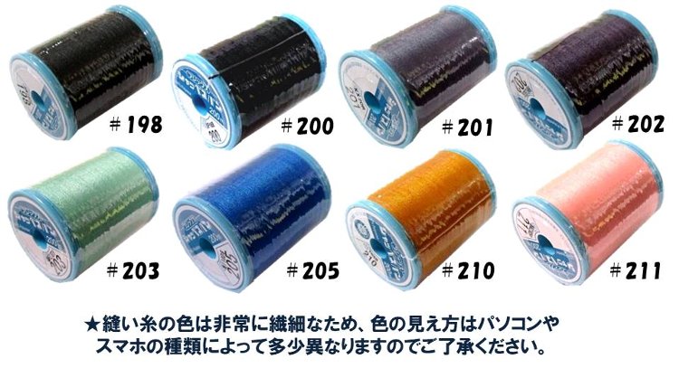 <定番の縫い糸(ミシン糸)です> ”布に合わせておまかせ” もあります。 ◆複数の生地をお買い上げの場合は、どの生地に合わせるのか、備考欄にわかるようにご記載ください。 ●ポリエステル100% ●太さ−60番手 ●長さ−200m ★シャッペスパンはメール便(ゆうパケット)で発送可能です。 ★縫い糸の色は非常に繊細なため、パソコン上に正確な色を 再現することは不可能です。色はパソコンの種類によって 多少異なりますのでご了承ください。 色指定分 縫い糸(シャッペスパン・ミシン糸) 基本色はこちら 色指定はこちら