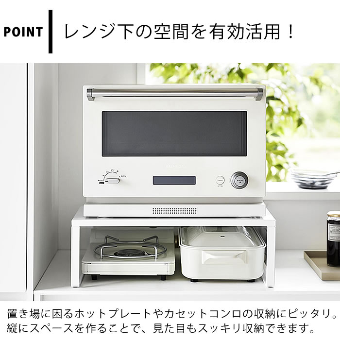 商品名 オーブンレンジラック タワー 商品詳細 サイズ 外寸:約 W50×D40×H16.7cm 内寸:約 W45.7×D40×H15.2cm 重量 約4.3kg 耐荷重 約25kg(静止荷重) 素材 本体:スチール(粉体塗装) クッション:シリコーン 仕様 組立式 付属品 六角レンチ 原産国 中国 備考 ※お使いになる電子レンジ・オーブン等の取扱説明書をよく読んでご使用ください。 ※壁から離して設置するなど、電子レンジ・オーブン等の排気口を塞がないようご注意ください。 ※加熱したばかりの鍋ややかん、食器などは置かないでください。 ※製品を濡れたまま放置したり、濡れた物を置いたままにしないでください。錆や変色の原因になります。 ※直射日光のあたる場所や、火の近く、高湿度になる場所では使用しないでください。 ※サイズや形状によっては収納できない物もあります。 検索キーワード レンジ下 収納 オーブンレンジラック タワー tower レンジ台 レンジラック 家電下ラック おしゃれ シンプル カウンター上 白 黒 マグネット収納 タワーシリーズ 1442 1443 キッチン収納 山崎実業 yamazaki ヤマジツ ラッピング ラッピングNG →詳細はこちらオーブンレンジラック タワー レンジ下を有効活用!見た目もすっきりシンプルな収納ラック オーブンレンジの下を収納として有効活用できるラック。置き場に困るホットプレートやカセットコンロの収納にピッタリ。縦にスペースを作ることで、見た目もスッキリ収納できます。スチールパネルは、キッチンのレイアウトに合わせて左右どちらでも取り付け可能。パネルにマグネット収納アイテム(別売)やお手持ちのマグネット製品を取り付ければ、より便利にご使用いただけます。 ※マグネット収納アイテムは付属しておりません。 関連商品 マグネット キッチントレーホルダー タワー 2個組 伸縮レンジラック タワー スチールパネル付きレンジラック タワー W75 ツーウェイ キッチン家電下引き出し&スライドテーブル タワー →シリーズ一覧を見る シンプル&クールな暮らしに「tower」一覧