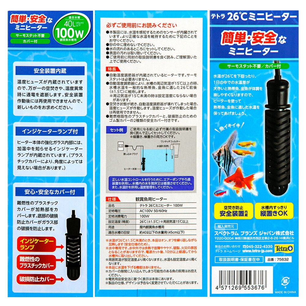 26℃に水温をキープ!テトラ 26℃ミニヒーター 100W 安全カバー付対象淡水・海水両用水量約40L(45cm)の観賞魚水槽※寒冷地や常温の低い場所でのご使用の場合、容量の高めのヒーターをご使用ください。特長●自動温度調節器が内蔵されているヒーターです。サーモスタットは必要ありません。●自動温度調節器により、水槽の周辺気温が15℃以上の時、水槽水温を一般的な熱帯魚、金魚に適した26℃前後(±1.5℃)に維持します。※周辺気温が15℃未満のときは設定温度にならない場合があります。●安全装置内蔵で、空炊き状態が続いて自動温度調節器が故障した場合、温度ヒューズが作動して電源をカットします。温度ヒューズが作動した場合は再復帰しません。●インジケーターランプ付き、ヒーター本体のガラス内部には、加温中を知らせるインジケーターランプが内蔵されています。(プラスチックカバー装着時には見えない場合があります。)●2種類の安全カバー付き、難燃性のプラスチックカバーが加熱部をカバーし、底部ゴム製カバーがガラス部の破損を防止します。内容量1本仕様定格電圧:AC100V 50/60Hz定格消費電力:100W温度精度:26℃(±1.5℃)安全装置:温度ヒューズ内蔵ご注意※本品は安全のため、水槽の水温が26℃±1.5℃未満の時でも本体の温度を過度に上昇させないようにオン/オフを繰り返す仕様になっております。このため、水温が25℃以下でも一時的にインジケーターランプが点灯していない場合がありますが、これは故障ではありません。しばらくしてから再度インジケーターランプをご確認ください。※カバーのすき間に入り込んでしまう可能性のある魚の飼育はお控えください。※電源のオン・オフを繰り返しながら、徐々に水温を上げ、26℃にする仕様となっております。数時間電源がオフになる場合もございますが、故障ではありません。※本製品には、水温を感知するためのセンサーが内蔵されています。より正確な水温を維持するために下記の事をお守りください。※砂の中に埋めないでください。※水の流れのあるところにセットしてください。※表面の汚れは取り除いてください。※ご使用前に同封の取り扱い説明書をよく読み、ご理解いただいた上でご使用ください。※ご使用になる前に必ず付属の取扱説明書をよく読んで、正しくセットしてください。※正しい水温コントロールを行うために、エアーポンプやろ過装置を併用し、水槽内の水を攪拌または循環させてください。また、水温計を併用し温度管理をしてください。※周辺温度が設定温度より高くなりますと、水温も設定温度より高くなります。※本品に水温を下げる機能はありません。※電気用品安全法に基づく表示は本体にあります。検索用キーワードテトラ 26℃ミニヒーター 100W 安全カバー付 4571269553676 20221031 y22m10 mura アクアリウム アクアリウム用品 アクア用品 保温 ヒーター ミニヒーター オートヒーター サーモスタッド不要 カバー付き 簡単 安全 tetra スペクトラム ブランズ ジャパン 水槽内 水中 26度 自動温度調節 空焚き防止 縦置き 熱帯魚 金魚 SHマーク対応 統一基準適合 SP規格適合 45cm水槽 40L以下 サーモスタット+ヒーター一体型 安全機能付 4560147396726 水槽用ヒーター 水槽 heater 保温器具 寒さ対策
