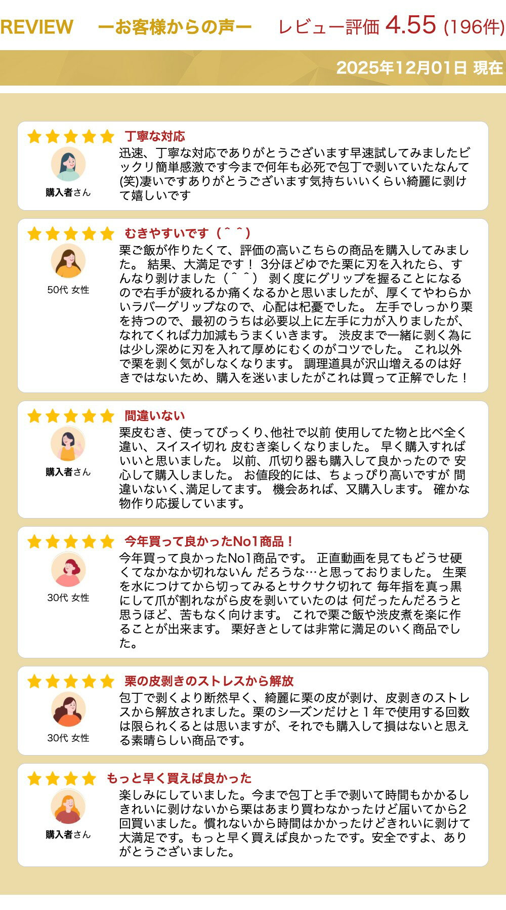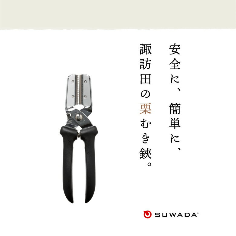 【商品説明】『栗くり坊主』はハサミ式、一方に切れ味の鋭い切刃があり、もう一方にはギザギザの刃がついています。ギザ刃で栗を押さえて、握ると切刃が動き、それを少しずつ繰り返すことにより、リンゴの皮をむくように、栗の鬼皮と渋皮が一緒につながって切れるアイデア商品で、簡単に栗を剥くことが出来るので包丁を使って剥くよりも危なくありません。従来型『栗くり坊主』をさらに使いやすく改良した『新型栗くり坊主』は、握りやすく疲れにくい形状設計に加え、栗の渋の汚れも気にならないブラックハンドルを採用しています。刃は交換可能な替刃式になっていて経済的で、栗を沢山剥かれる方におすすめです。また、左右の刃を入れ替えてご使用できますので、左利きの方も問題なく使うことができます。栗のお尻の部分から先に向かって、皮の筋に沿って剥き始めるとやりやすくいです。2、3個むいて慣れてくると、手加減で薄くも厚くも剥くことができるようになります。鬼皮だけを剥き渋皮煮も楽しめます。鬼皮を栗くり坊主でギュッとつまんで むしり取るようにします。■汚れが目立ちにくいブラック■クラシックで大人な色合いがオシャレ■エラストマー樹脂ハンドルが滑りにくく、疲れにくい■替刃式でお手軽■使用後はステンレス製ストッパーを掛けて安全に収納可能【用途】■栗の皮むきに【全長サイズ】■約170mm【重量】■約140g【材質】■刃部:最高級刃物鋼■ハンドル部:鉄(クロームメッキ)、エラストマー樹脂(耐熱温度80℃)■保護キャップ:ポリプロピレン(耐熱温度120℃)【備考】■付属品:保護キャップ(替刃1枚付)※別売りで替え刃セットもご用意しています。【注意事項】※一点一点手作りのため、サイズ・重量には若干の誤差があります。※本品は生栗・固ゆで栗専用の栗剥き鋏となっております。※刃はカミソリ並みの鋭利なものになっております。取扱には十分ご注意ください。※切刃に力を入れると、刃が滑って手をキズつける場合があります。ギザ刃に力をかけて握る ようにしてください。※古くて乾燥した栗の場合は、一晩水に漬けておくと皮が柔らかく剥きやすくなります。【メーカー】■諏訪田製作所(SUWADA)【諏訪田製作所/スワダ/SUWADA/三条市/調理器具/調理小道具/台所用品/キッチン用品/便利グッズ/便利用品/皮むき/ピーラー/秋の味覚/食欲の秋/茶碗蒸し/キッチンバサミ/キッチンハサミ/キッチン鋏/料理/おつまみ/栗ご飯/スイーツ/炊き込みご飯/栗と銀杏の白和え】