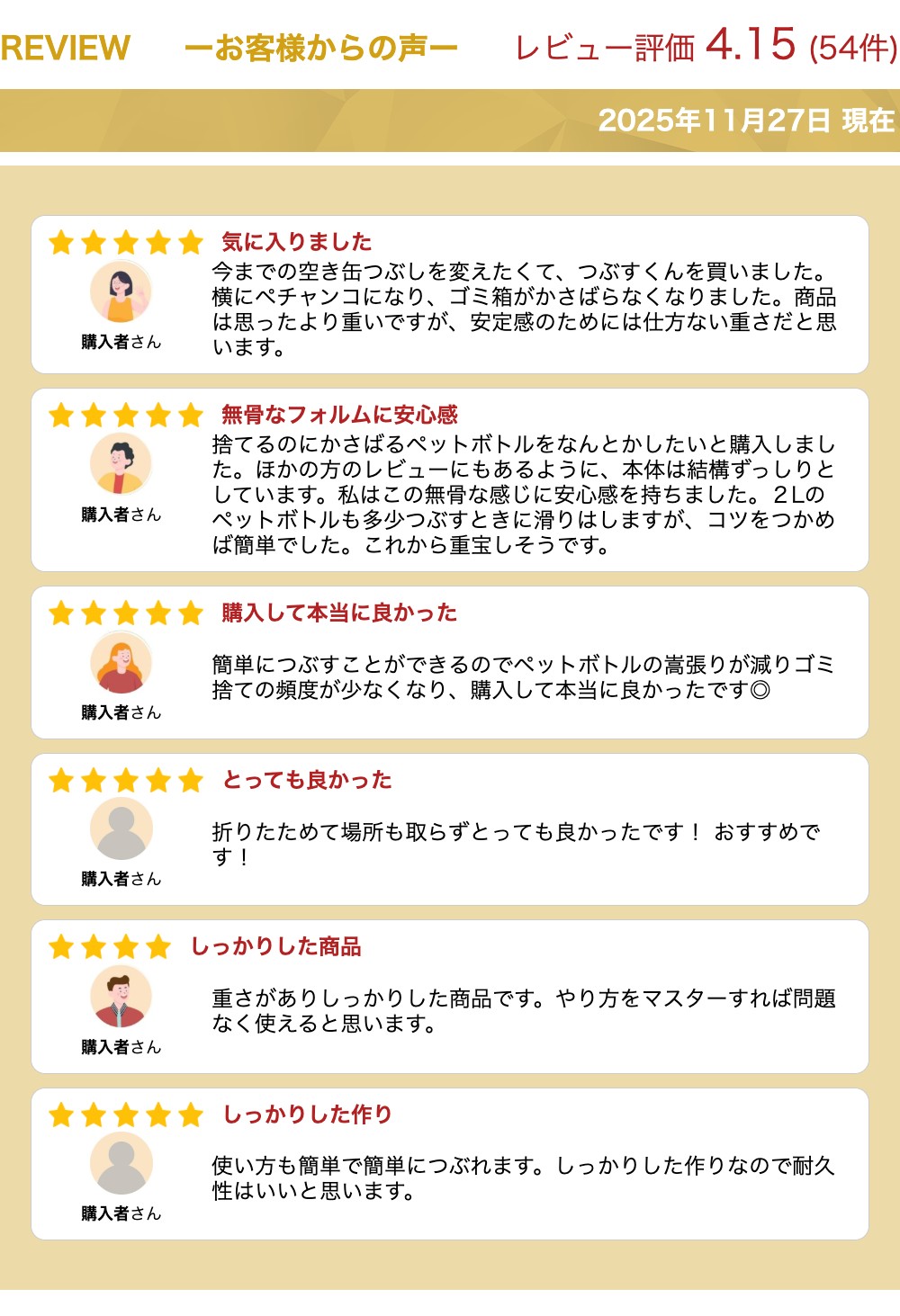 空き缶、ペットボトルのリサイクルに【商品説明】●ツメ付なのでアルミ缶、スチール缶、ペットボトルが固定され潰し易くなっています。●スプレー缶のガス抜き機能付き。(※スプレー缶は潰せません)●磁石付だから缶のアルミ、スチール選別がカンタン!●スプリング付なので自動で持ち上がります。【サイズ】●製品サイズ(本体収納時):W320×D135×H50mm(約)【重量】●約2.3kg【材質】●本体:鉄(粉体塗装)●持手/ストッパー:鉄線(クロームメッキ)【製造国】●中国【備考】●表面処理:粉体塗装(ハンマートンブラウン)●飲料缶は500ml缶、ペットボトルは2リットルのものまでが適応サイズです。[ONOE 尾上製作所 萬年 省スペース コンパクト ごみ捨て ごみ処理 片づけ 掃除 整理整頓 便利グッズ 簡単 かんたん お手軽 リサイクル ペットボトル アルミ缶 スチール缶 あき缶 空き缶 ビール缶 ジュース缶 制汗剤 ヘアスプレー缶 ガスボンベ ガス缶 スプレー缶 カン ガス 抜く 抜き プレス 圧縮 ぺっちゃんこ ぺちゃんこ ぺたんこ つぶしやすい 潰す]関連商品[ポイント最大15倍] 【カバー付きですぐに使えます】日本製 トタン ...[ポイント最大15倍] 尾上製作所 ONOE いもやきやっくん DX...[ポイント最大15倍] 下村企販 竿止め 竿外れ防止 ダブルピンチ 2...2,350円2,420円2,200円[ポイント最大15倍] トタン ブリキ 散水ジョーロ 4L 大容量 蓮...[ポイント最大15倍] 膝あて 2個組 どこでも ひざあてクン 2個組...[ポイント最大15倍] 尾上製作所 ONOE バケツ工事用2号 12L...2,480円1,680円2,350円[ポイント最大15倍] 尾上製作所 トタン 湯たんぽ (カバーなし) ...[ポイント最大15倍] 焚火 ミニかまど MK-125 コンパクト ア...[ポイント最大15倍] コンパクトピザオーブン 交換用 ピザストーン ...2,080円2,650円2,240円-