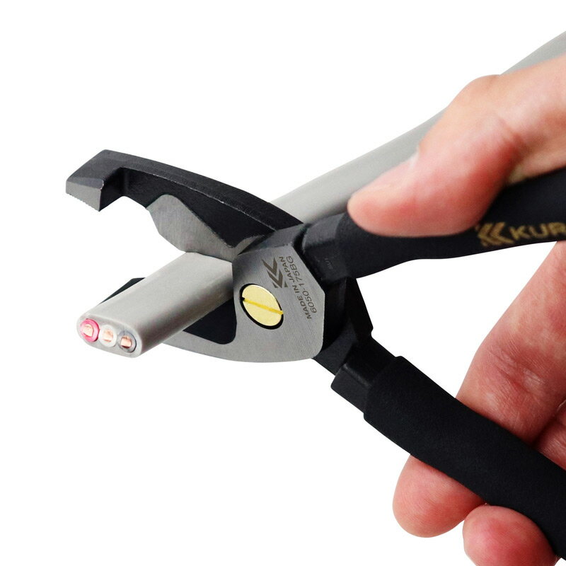 【商品情報】●このペンチ切れすぎ注意!●VA線がサクサク切れる!ケーブル切断刃●【ケーブル切断刃】:芯線を1本ずつ切断していく特殊形状の刃により、力が分散され1/3の力で切断可能。※弊社偏芯ペンチ比較※こちらの刃で硬線を切らないでください。●【くわえ部】:くわえ部がラウンドしているため、3点で部材をしっかり掴みます。●【硬線切断刃】:根本側の刃は高周波焼き入れを施すことで、ピアノ線などの硬線の切断が可能です。●【新締結方式】:10万回開閉してもガタつきが少ない新締結方式を採用。刃の摩耗が少なく高耐久です。●【グリップ形状】:グリップにくびれを付けることで、片手でも力が入りやすく握りやすい設計です。●VA/VVFの切断、鉄線、ピアノ線の切断などにお使い頂けます。●樹脂グリップ付き。【商品仕様】●単品サイズ(mm):長さ183×幅45×高さ13●単品重量:282g●パッケージサイズ(mm):長さ225×幅75×高さ20●パッケージ重量:307g●切断能力(mm):〈VA/VVF線〉/Φ2.6x3芯、〈IV線〉/22mm2、〈鉄線〉/φ2.0、〈ピアノ線〉/φ0.8●材質:特殊鋼●バネの有無:無●RoHS対応:対応●生産国:日本【その他】●電気の流れている物への切断は絶対にしないでください。感電の恐れがあります。●本来の目的以外では使用しないでください。●作業時は周りの安全を確かめてご使用ください。●保護メガネ等を着用して作業してください。●能力以上の使用はしないでください。●切断部材によっては性質上表面に跡がつく場合がありますが品質上問題はありません。関連商品[ポイント最大15倍] フジ矢 黒金 ケーブルペンチ 200 6050...[ポイント最大15倍] フジ矢 黒金 偏芯パワーペンチ 200 300...[ポイント最大15倍] フジ矢 黒金 偏芯パワーペンチ 225 300...5,110円5,420円5,480円[ポイント最大15倍] フジ矢 黒金 電工名人強力ニッパ黒金 770-...[ポイント最大15倍] フジ矢 黒金 偏芯強力ニッパ 175 700N...[ポイント最大15倍] フジ矢 黒金 電工名人強力ニッパ黒金 770-...4,880円5,120円5,120円[ポイント最大15倍] フジ矢 黒金 メカニックプライヤー クロスロー...[ポイント最大15倍] フジ矢 黒金 ネジバスター NSP01-150...[ポイント最大15倍] フジ矢 黒金 偏芯強力ニッパ 200 700N...5,360円2,280円5,240円