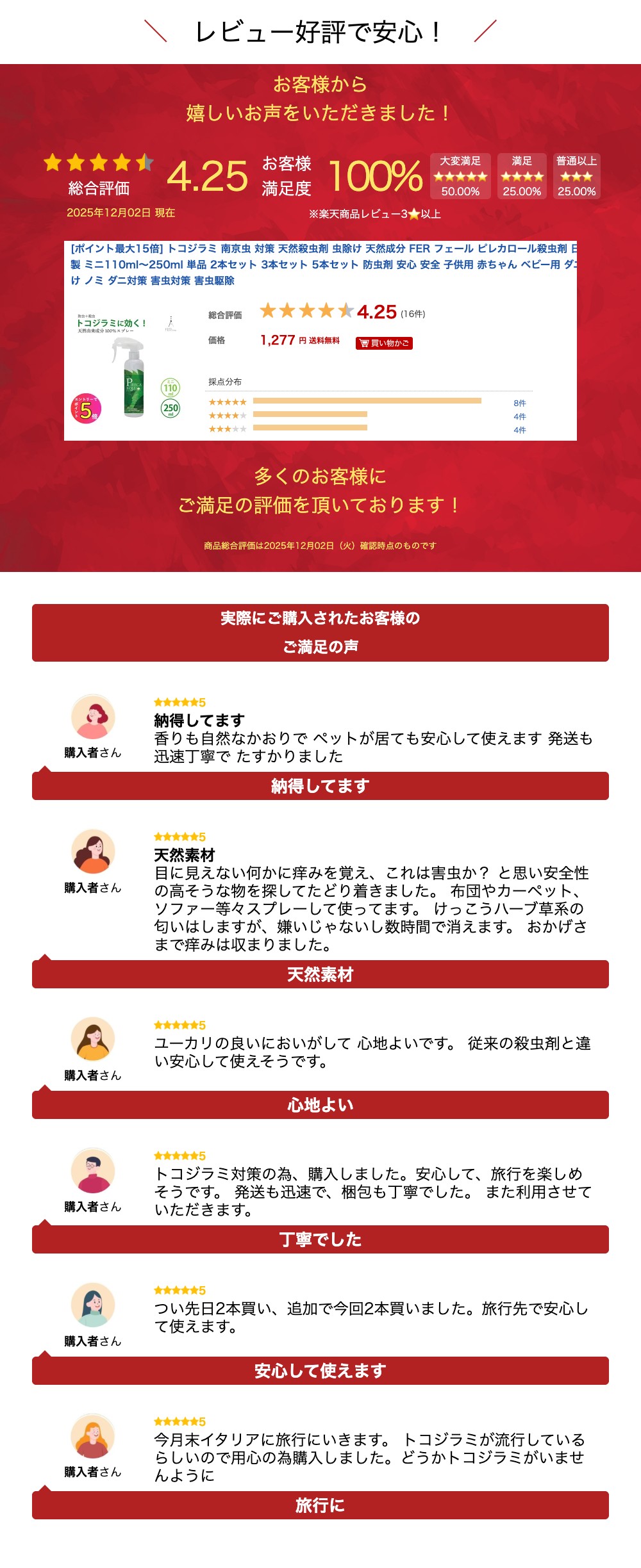 【FER/フェール】モノ。それは人々の生活のいつも傍にある存在。ひとつひとつのモノに1人ひとりのストーリーを。相手のことを想いながらプレゼントする、モノ。快適な暮らしのために心を込めて使う、モノ。人が人を想う、そんな見えない想いもカタチに変えて。ミライ。今この瞬間の積み重ねで作られる時間。ひとつひとつの瞬間が1人ひとりのこれからに。モノがあるだけで心が豊かになる、ミライ。からだに優しいモノで生活が健やかになる、ミライ。モノを通じてヒトの暮らしのミライを豊かにする。そんな「ミライをつくるモノづくり」それが私たちの使命です。【種類】●ミニ 110ml 単品●ミニ 110ml 2本セット●ミニ 110ml 3本セット●ミニ 110ml 5本セット●250ml 単品●250ml 2本セット●250ml 3本セット●250ml 5本セット【商品説明】●大切な家族に使う物にこだわりたい。その想いから原材料にこだわりユーカリオイルは100%オーストラリア産を使用。●製造工程にもこだわり、全て日本で生産しています。●体に優しい天然成分のみで丁寧に作り上げた、虫除け+殺虫Wの力を発揮する医薬部外品。●ピレカロールの優しさ、効果をぜひ体感してください。●※1 医薬部外品は、有効成分の種類と分量、効能・効果、用法・用量、安全性等について総合的に審査され、厚生労働大臣の製造販売承認を受けて販売される物。●植物素材除虫菊エキス・ユーカリオイル・レモンセントティツリーオイルを成分とし、添加成分も植物性油脂等非石油系天然由来の医薬部外品承認水性天然殺虫剤です。●天然由来成分のユーカリオイルやレモンセントティツリーオイルの爽快感ある香りが広がり、嫌な殺虫剤の臭いはしません。●一般的な殺虫剤のようなエアゾール式(石油系溶剤)やLPG噴射ガス使用殺虫剤とは異なり、引火や爆発の危険がないトリガー式スプレーです。●オーガニック認証食品工場でも使用することができる殺虫剤として日本農林規格基準をクリアしている商品です。●ユーカリは殺菌効果が高く、ハウスダストによる空気の汚れなどにも有効とされています。また、ユーカリの葉の精油成分に含まれている成分、シネオールが、優れた抗菌作用で風邪や感染症の予防に役立ちます。●多くのアレルギー性鼻炎、喘息、アトピー性皮膚炎の原因とされているヒョウヒダニの忌避効果に優れています。ヒョウヒダニは普通の洗剤や石鹸だけでは駆除しにくいので、ユーカリが効果的とされています。 感染症の予防に役立ちます。●大切な愛犬愛猫へ:ケージ周りにスプレーをするだけで、ノミやダニが寄り付きにくくなります。●玄関周りにスプレーすることで、散歩帰りなどに外部から持ち込む虫の侵入を防いでくれます。●ダニが繁殖しやすいベビー敷布団や衣服に一吹きすることにより、ダニを防ぎ、赤ちゃんの大切な肌を効果的に守ります。●畳・カーペット・カーテン・網戸・フローリングなど場所を問わず使用することができます。●ゴキブリなどの害虫の駆除や、ゴミ周りのヒョウバエなどの駆除にも使用していただけます。●持ち運びしやすいミニサイズが誕生。 キャンプや山登り、お庭や公園、釣りやサイクリングなど、さまざまでシーンで使いやすいサイズの防虫・殺虫スプレー バッグやリュックに入れて持ち運びでも安心なストッパー付きです。【成分】●精製水、天然除虫菊エキス、ユーカリオイル、レモンセントティツリーオイル、他3成分(天然由来成分)【備考】●ハエ・蚊・ゴキブリ・ノミ・イエダニ・トコジラミ(ナンキンムシ)に向けてスプレーで適宜噴霧してください。●害虫に付着するように直接噴射してください。 ●人体に向かって噴霧しないでください。●噴霧液を直接吸引しないでください。 ●万一、誤って薬剤を飲み込んだ場合や、身体に異常を来した場合などには、直ちに使用を中止し、医師の診察を受けてください。 医師の診察を受ける際には、成分名・症状・被爆状況などについて 出来るだけ詳細に医師に告げてください。 【その他】●防除医薬部外品●販売元:株式会社FER●製造国:日本●広告文責:株式会社福井/TEL(072-227-0001)[フェール ピレカロール PIRECA ROLL 4538160000302 FER 4935137901479 日本製 忌避剤 天然殺虫剤 防虫剤 殺虫スプレー 防虫スプレー 天然成分 天然素材 天然水性害虫駆除剤 環境にやさしい ユーカリオイル オーガニック 虫除け 虫よけ 虫退治 抗ウイルス・抗菌効果 安心 安全 こども用 ベビー用 赤ちゃん BABY ペット トコジラミ ダニ除け ノミ トコジラミ 南京虫用 旅行 トラベル 携帯用 持ち運び 便利 助かる 家具 インテリア 荷物 ホテル コンパクト ミニサイズ コンパクト 衛生用品 アウトドア キャンプ 釣り フィッシング 登山 山登り お出掛け]関連商品[10月エントリーでP10倍!] 天然成分だから安心 観葉植物 土 コ...[10月エントリーでP10倍!] 【白蟻被害 埋めるだけで巣ごと壊滅】...[10月エントリーでP10倍!] シロアリ 白蟻 羽アリ ハネアリ 巣...1,150円1,480円1,320円[10月
