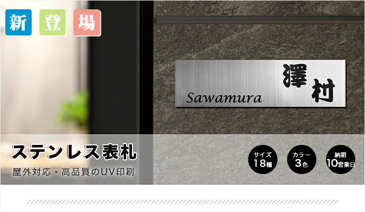 ●ステンレス表札 UV印刷 【送料無料】 高品質ステンレスを使用した、歪みや色の変色に強いステンレス板を使用しております。 文字が消える心配もなく、屋外でも使用できます。 屋外対応・高品質のUV印刷 ●配送方法 この商品は、無料ネコポスにて発送いたします。