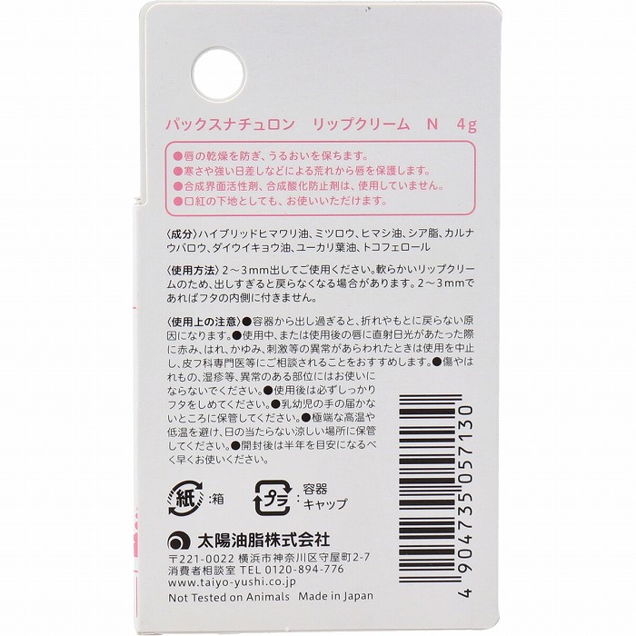 商品名 パックスナチュロン リップクリーム 4g 商品説明 ●唇にツヤと潤いを。唇の乾燥を防ぎ、うるおいを保ちます。●天然保湿成分シアバターを配合したリップクリームです。●寒さや強い日差し、エアコンなどによる唇の乾燥や荒れを防いで、潤いを保ちます。●合成界面活性剤、合成酸化防止剤は使用していません。●口紅の下地として大変使いやすい無着色タイプです。 商品サイズ/重量 個装サイズ:61X104X19mm個装重量:約18g内容量:4g 成分 ハイブリッドヒマワリ油、ミツロウ、ヒマシ油、シア脂、カルナウバロウ、ダイウイキョウ油、ユーカリ葉油、トコフェロール 使用方法 ・2〜3mm出してご使用ください。・軟らかいリップクリームのため、出しすぎると戻らなくなる場合があります。・2〜3mmであればフタの内側に付きません。 使用上の注意 ・容器から出しすぎると、折れやもとに戻らない原因になります。・使用中、または使用後の唇に直射日光があたった際に赤み、はれ、かゆみ、刺激等の異常があらわれたときは使用を中止し、皮フ科専門医等にご相談されることをおすすめします。・傷やはれもの、湿疹等、異常のある部位にはお使いにならないでください。・使用後は必ずしっかりフタをしめてください。・乳幼児の手の届かないところに保管してください。・極端な高温や低温を避け、日の当たらない涼しい場所に保管してください。・開封後は半年を目安になるべく早くお使いください。 区分/製造国 化粧品/日本 JANコード 4904735057130 広告文責 株式会社メディアリンク 0276-55-5551 発売元 太陽油脂株式会社