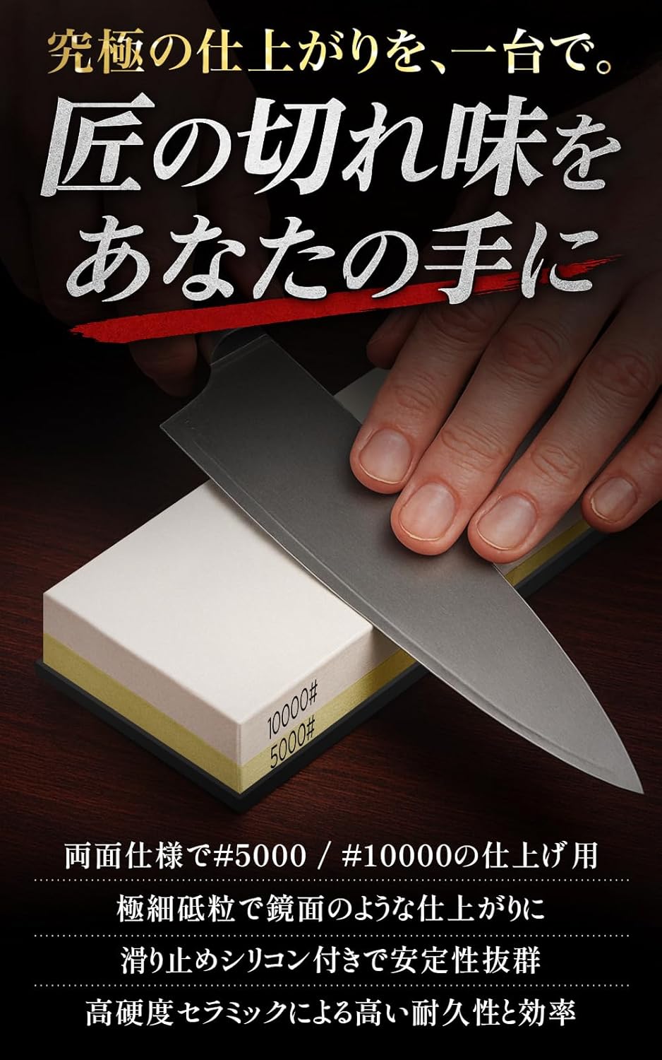 商品情報 セット内容 砥石本体×1 粒度 ・#5000/#10000 仕上げ用砥石 ・#15000 仕上げ用砥石 使用範囲 包丁、刃物、ステンレス刃物、ナイフ、カンナ、ハサミ、彫刻刀など サイズ 約横18cm×約縦6cm×約厚さ3cm 重量 【#5000/#10000】約690g 【#15000】約340g 特徴 【粒度5000/10000目の仕上げ用砥石】高品質な粒度#5000/10000目の砥石の組み合わせ。砥粒が細かい、仕上げ用の両面砥石となり、1台で2役の仕上げ工程が対応可能で、砥磨、磨きの仕上げ作業がスムーズかつ効率的に行えます。 【粒度15000目の仕上げ用砥石】研磨効率が高く、耐久性が高い素材を使用していることが特徴の砥石です。研磨後は包丁や刃物の鋭さを高め、表面は光沢があり滑らかな仕上がりに。刃物や工具などを研磨する際におすすめの砥石です。 【高品質な素材】高品質な素材を使用し、加工技術にも優れているため、砥石から取り出される砥粒はきめ細かく、仕上げの砥磨作業がスムーズかつ効率的に行えます。研磨時間を短縮することで、作業効率を向上させることができます。 【安心の耐久性】長期間使用しても研磨効率が落ちにくい砥石素材を使用。耐久性が高いので、長くお使いいただくことができます。 【高い平滑性】研磨後の刃物や工具などの表面は光沢があり滑らかですが、研磨後の鋭さを保つためにも、平滑な表面を保つことが重要です。この仕上げ用の砥石で磨くことで、研磨後の平滑性を高め、刃物の鋭利さを維持するのに最適です。 【安心の品質保証】商品は一つひとつ丁寧に検品、梱包しておりますが、万が一商品に問題があった場合は、ご購入から30日以内であれば返金・返品、交換等に対応させていただきますのでご連絡ください。誠心誠意対応させていただきます。 注意事項 ※モニター設定や光の加減等によって実物と画像の色が若干異なって見える場合がございますので、予めご了承ください。 ※サイズ表記につきましては、手動での採寸の為若干の誤差が生じる場合もございますので、予めご了承ください。 キーワード 砥石 仕上砥石 プロ 包丁研ぎ器 面直し 仕上げ用 天然 5000番 10000番 両面砥石 家庭用 包丁研ぎ 手入れ 面取り砥石【送料無料】PLEAVIT 砥石 仕上げ #5000/10000 #15000 両面 包丁 研ぎ 研磨 ステンレス ナイフ 鏡面仕上げ 業務用 家庭用 研ぎ器 両面砥石 刃物 研ぎ石 とぎ石 砥石台 包丁砥石 包丁研ぎ石 包丁研ぎ器 ナイフ 包丁とぎ 【製品特徴】 -高い研磨効率:高品質な粒度#5000/10000目の素材の組み合わせ。砥粒が細かい仕上げ用の両面砥石となり、1台で2役の仕上げ工程が対応可能。#15000は仕上げ用の高品質な砥石素材を使用しており、砥石から取り出される砥粒が細かく、砥磨、磨きの仕上げ作業がスムーズかつ効率的に行えます。 -耐久性:砥石の素材や製造技術が優れているため、長期間使用しても研磨効率が落ちにくく、長くお使いいただけます。 -研磨後の仕上がりの鋭さ: 5000目/10000目の細かい粒度で仕上げているため、砥磨後の刃物や工具の鋭さの向上におすすめです。 -研磨後の平滑性: 研磨後の平滑性も高く、研磨後の表面は光沢があり滑らかな仕上がりに。