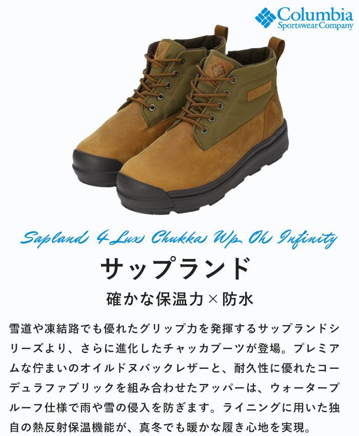 【P5倍/10%OFF/2025秋冬新作】コロンビア Columbia ブーツ チャッカ サップランド メンズ レディース 保温 防水 暖かい 防滑 滑らない 熱反射 コーデュラ オイルドヌバックレザー SAPLAND IV LUX CHUKKA WP OH INFINITY ウォータープルーフ ウィンターブーツ 雨 雪 YU9887