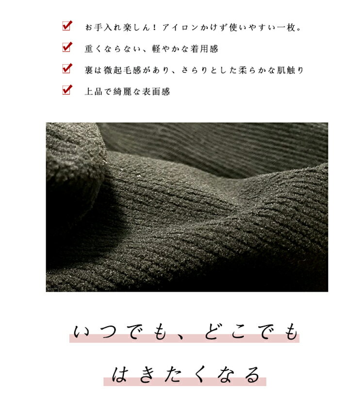 【商品情報】 ■サイズ(cm) 表示サイズ:フリー 総丈:81cm ウェスト:70cm ヒップ:108 ■備考 【素材】コーデュロイ 【裏地】なし 【透け感】なし 【伸縮性】なし ※寸法は手測りなので若干誤差がございますが、ご了承くださいませ。 ※お品物の色合いは、写真撮影、パソコン画面表示等の環境の違いにより、若干異なる場合がございますので予めご了承くださいませ。