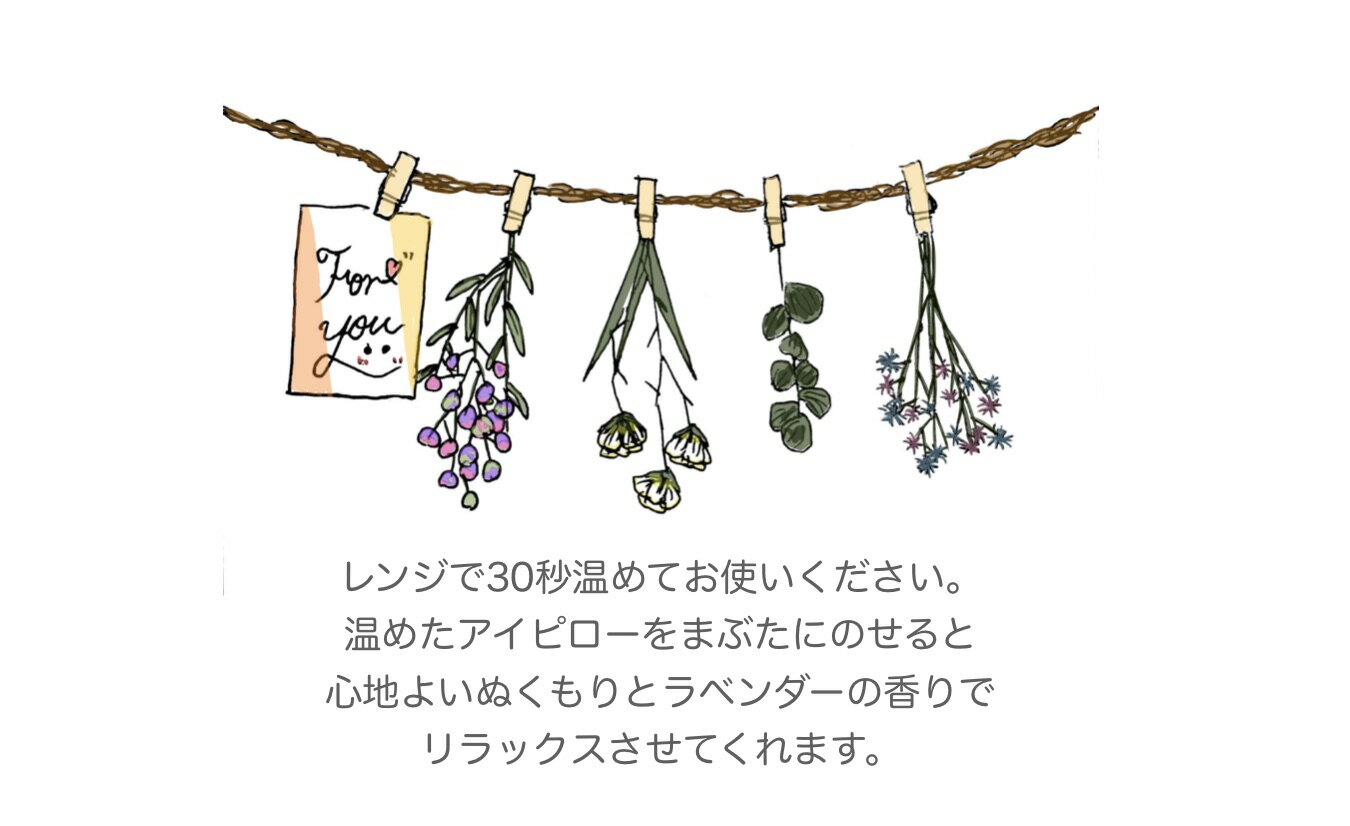 ■離島・一部地域は追加送料がかかる場合があります。 ■材質:表生地:綿85% 麻15% 中生地:綿100% ■中身:緑豆 ラベンダーポプリ ■サイズ:約9×21cm ■カラー:パープル ブルー 生成 アイピロー 電子レンジであたため・疲れた目元にあたたかアイマスク 冷蔵庫で冷やしてもクールな使い心地 ラベンダーの香りでリラックス雑貨 癒しのアロマアイマスク 温めても冷やしてもお好みで使える2ウエイタイプ 眼精疲労や睡眠にハーブの力でリラックス ※電子レンジでの温め過ぎにご注意ください。目安は30秒です。 ※冷やしてお使いになる場合は冷凍庫で凍らせないでください。 ゆうパケットでの配送 ご購入手続きの際、「ゆうパケット」をお選びください。お選びいただかない場合、宅配便の送料が別途加算されます。 ※「ゆうパケット」はポストに投函されます。 ※代引き・日時指定はできません。 代引、日付指定をご希望のお客様は、宅配便(送料別)をご利用ください。 ※クリスマスやお誕生日、ちょっとしたお礼に。プチプラギフト。 ♪素敵な玄関まわり&お庭づくりをお手伝いします♪ ≫当店の紹介はこちら メーカー希望小売価格はメーカーカタログに基づいて掲載しています。目元用アイピローマスク(メガネ型) 疲れた目元をじんわり暖めるホットアイピロー、クールに引き締めるひんやりアイピローの2wayタイプ ※カバーは外してお洗濯できます。 アイピローを使うことで、寝つきが良くなった!!夕方の目の疲れ具合が違う、偏頭痛と目の奥が痛かったのが軽減された!など・・・さまざまな声をいただいております。 じんわり温めながら・ツボ押しも効果的 呼吸に合わせてツボにゆっくり圧を加えて、痛気持ちいいくらいの強さで5秒くらいキープしてみてください。 体調に合わせて毎日行うと効果的です。 何色にしようかな・・・ 選べるカラー ■こちらの商品もおすすめです 人気雑貨をまとめ買い「プルーマスイートクリップ」 カラフルでかわいい洗濯バサミを12個入り〜48個入りをお好みの数量で選べます。 ギフト・プレゼントにもオススメです。≫続きを見る 一番人気の拡大鏡「クロームシルバー(3倍)」 シンプルなシルバー色で、どんな洗面台にも合わせやすい拡大鏡。 もっとも低価格なのも一番人気の理由です。≫続きを見る アイピローの姉妹品ネックピロー 首や肩を温めて温活しませんか? ギフト・プレゼントにも最適です。≫続きを見る 他の雑貨は → こちら ガーデニングやDIYが趣味の方におすすめの、ガーデンキットが揃っています。