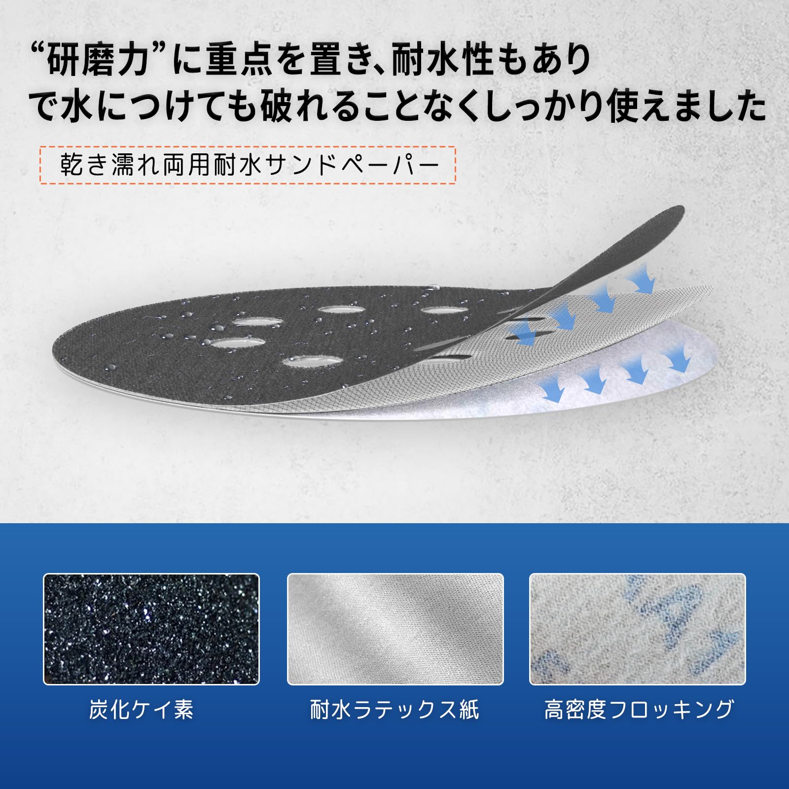 商品情報商品の説明主な仕様 ?【研削効率がアップします】炭化ケイ素耐水ペーパー、乾き濡れ両用サンドペーパー には地球上で3番目に硬い化合物である炭化ケイ素を採用しました "研磨力"に重点を置き、耐水性もあり、意外と耐久性、で水につけても破れることなくしっかり使えましたbr?【幅広い使用用途】曇ったヘッドライトの研磨と広く木製品、木材のバリ取り、金属の錆の除去、石を 、ゴム製品、プラスチック、革などの材質の艶出し、塗装前の下地研磨などの多用途に適用できますbr?【おすすめの使用方法】#120~#240:素材の粗磨き、塗装前の木材の下地作り、サビ落としなど#400~#800:荒く研磨した後の仕上げ、重ね塗りの調整、研磨傷の修繕など#1000~#3000:塗装後の木材の艶出し、車の塗装リペア、陶器の水垢取りなど#5000~#10000:車や金属の塗装前の仕上げ、研磨の製品を確定したらbr?【使いやすいマジックテープ式】簡単に吸着が良い で外れることはありませんし、高速で耐久性のあるサンディングを提供することで、作業時間を節約し、集塵用に8つの穴を事前に打ち抜きます 穴の位置も正確でした目詰まりの心配はありませんbr?【ユニバーサル仕様】?准直径125mmサンディングパット 適用マキタ、ボッシュ、タックライフ、デウォルト、リョービ、フォンハウスなどさまざまな種類のランダムランダムサンダー DIYなら最高のセットです