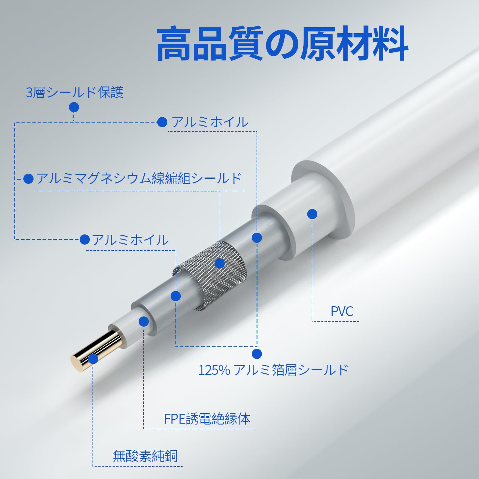 商品情報商品の説明主な仕様 【高品質の原材料】HiFind テレビアンテナケーブルは無酸素純銅OFC+FPE誘電絶縁体+3重シールド(アルミホイル+アルミマグネシウム線編組シールド+アルミホイル)+PVCを使用する。これにより、信号損失を最小限に抑え、高品質な映像や音声の伝送が可能になります。また、耐久性と柔軟性に優れており、長期間使用しても劣化しにくい設計になっています。さらに、外部からの電磁波干渉を効果的に防ぎ、安定した接続環境を提供します。これらの素材と構造は、プロフェッショナルな用途から家庭用まで幅広いニーズに応えることができます。br【安定した接続】このTVアンテナケーブルは3重シールド(アルミホイル+アルミマグネシウム線編組シールド+アルミホイル)構造を採用しています。この設計により、外部からの電磁波やラジオ周波数干渉を効果的に遮断し、安定した信号伝送を実現します。また、同軸ケーブル コネクタの接続部分には高精度の金メッキ端子を使用しており、腐食や酸化を防ぎながら信号のロスを最小限に抑えます。これにより、テレビの映像や音声がクリアで滑らかに再生されるため、ストレスのない視聴体験を提供します。br【柔軟性】高柔軟性PVC構造により、S-4C-FBケーブルを柔らかく保ちながら、bsアンテナケーブルの伸びに強く、丈夫、曲げにも耐えやすい。高品質なPVC素材により、低温環境でも柔軟性を損なうことなく使用可能です。断線防止設計を採用しており、繰り返しの曲げや引っ張りにも高い耐久性を発揮します。そのため、家庭用から業務用まで、幅広いシーンで安心してお使いいただけます。さらに、環境に配慮した素材を使用しており、安全性にも優れています。br【幅広い互換性】衛星放送/BS/CS/地デジ/CATV/2K/4K/8K(3224MHz)に対応。F型ネジ式:ネジ式コネクターは非常にしっかりと接続できるため、頻繁に抜き差しする機器の接続に適していますが、滑りが心配な場合にも最適です。差込式:直接接続、クイック接続、頻繁な抜き差しに適しています。同時に、ネジ式接続が面倒だと感じる場合は、これが最適です。L字プラグ:狭いスペースやコーナーの場所、収納が重要なシーンでの使用に適しています。 L 字型インターフェースによりスペースを節約し、より多くの可能性を提供します。
