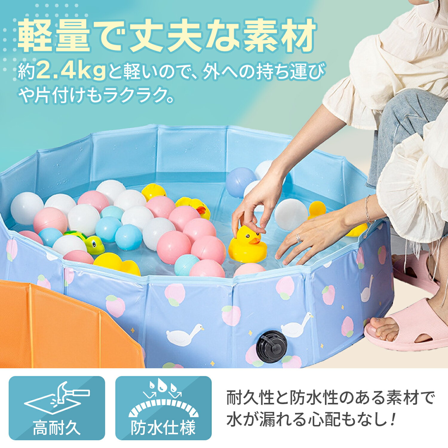 備考メーカー希望小売価格はメーカーサイトに基づいて掲載しています空気入れは必要無し♪・160cmビニールプール収納袋付き折りたたみクッションマット大きな3mの家庭用プール便利なフード付き子供用バスローブ3サイズ展開浮き輪レトロかわいいアームリング【商品仕様】 〇サイズ:直径120cm×高さ30cm 〇バリエーション:ブルー/オレンジ 〇素材:PVC、プラスチック板 〇重量:約2.4kg 〇お手入れ方法:水分をよく乾かし、拭き取って下さい 〇ご注意 ・寸法は個体により若干の誤差がある場合がございます。 ・ご使用のモニター環境により色味が若干異なる場合がございます。 ・底が薄い為、プールを置く付近に破損の原因となるトゲやガラス片、金属片、木片、砂利などがないか、ご確認ください。プールを置く場所にはプール専用マット、レジャーシートなどを敷いてから置いていただくことをおすすめします。ペットプールとしてのご使用の際は、爪にご注意ください。 ・内部ボードの素材の柄が透けて汚れのように見える場合がございます。ご了承の上、ご購入下さい。 【空気入れ不要の折りたたみプール】 空気を入れる手間が必要のない、折りたたみ式のプール。 120cmと大きめサイズなので、お友達や兄弟姉妹と一緒にプール遊びができます。 【手軽にプール遊び】 プールを広げて中に水を入れるだけでプール遊びができます! ビニールプールのように空気を入れる手間がなく、後片付けや設置も簡単♪ 【自立するパネル】 側面のパネルはしっかりと自立する為、水を入れてる間や遊んでいる間にぐらつく心配がありません。 【軽量で持ち運びもラクラク】 パネルがプラスチック製なので他社製品に比べ約2.4kgとかなり軽量! 屋内、屋外への持ち運びも手軽に行えます。 【選べる2種類のカラバリ】 ブルーとオレンジのポップでかわいい2カラーをご用意♪ どちらのデザインも、男女問わず使用できる可愛い柄になります。 ■便利な排水キャップ 外側面の下部に1箇所、排水用のキャップが付いています。 キャップを回して開けるだけで、簡単に中の水を抜く事ができます。 ■丈夫な防水仕様 耐久性と防水性のある丈夫な素材のため、水が外に漏れる心配もなし! ■ちょっとした贈り物にも お子さまやお孫さん、ご友人へのちょっとしたプレゼントなどにも喜ばれるかわいらしいデザイン。 温暖化が続く中で、手軽にお家プールが楽しめます! ■お水遊び以外での使用にも 屋外プールとしてはもちろん、砂遊び、屋内でのボールプール、プレイマットの代わりなどアイデア次第で色々な楽しみ方が可能なプール♪ 夏場のレジャーや外出先にもおすすめです。 ■組み立て方法 1.プール内の水を抜き、プールを半分に折る 2.端から順に交互に折りたたんでいきます 3.パネル部分と床部分を揃える 4.最後に折りたたんで完成