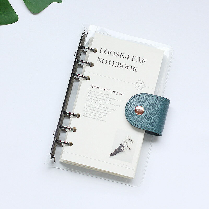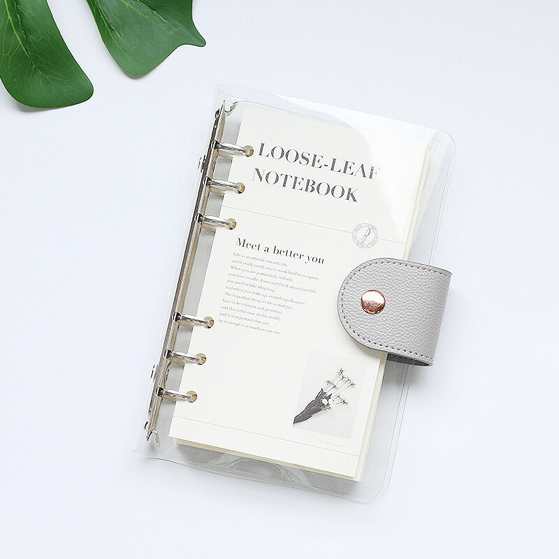 送料無料 ルーズリーフ A6サイズ 6穴 クリアバインダー ホルダー DIY手帳 取り外し可 レザー調ベルト スナップボタン ノートブック メモ帳 ステーショナリー 文房具 学校 授業 学生 学習