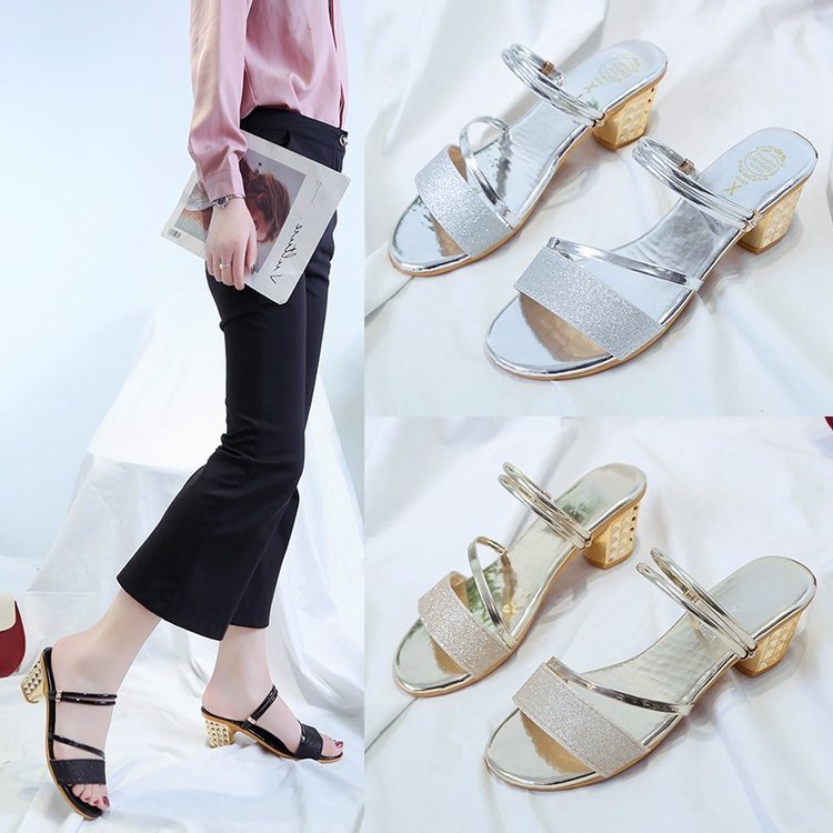 送料無料 サンダル ミュール 2way バックストラップ ハイヒール チャンキーヒール レディース 女性 靴 くつ シューズ キラキラ おしゃれ かわいい キレイめ