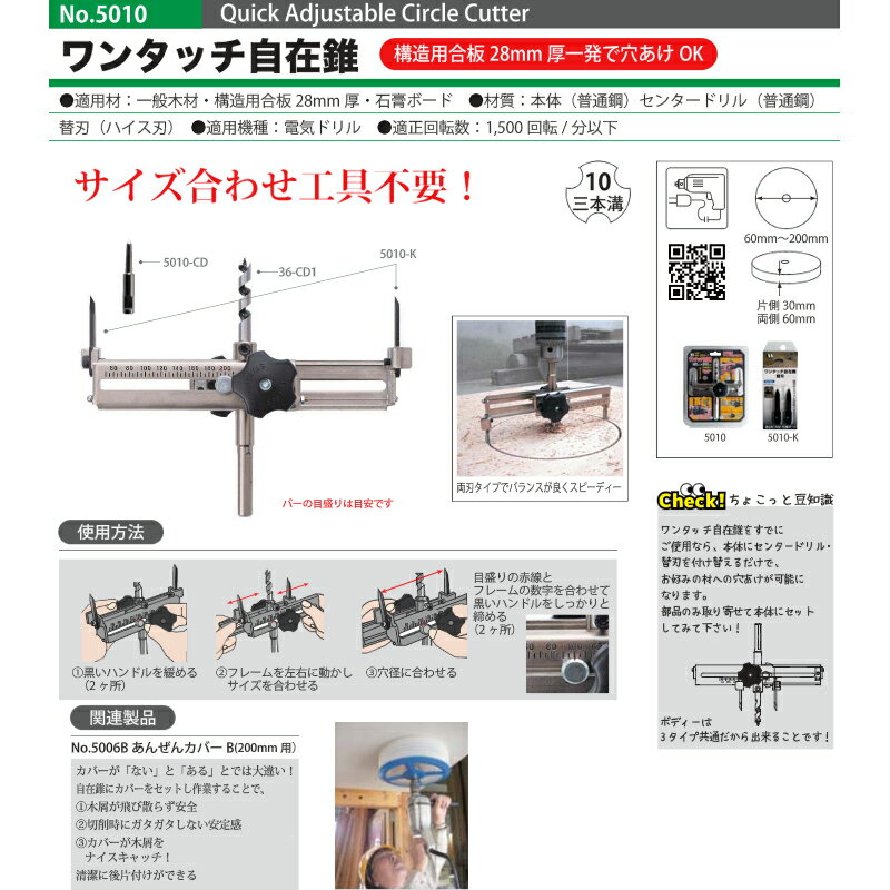 ◆画像は代表イメージ画像のため、形状や色が異なることがございます◆ ダウンライト・配管・ダクト等の穴あけに サイズ合わせ工具不要 No.5010 ワンタッチ 自在錐 セット 品番 : 5010 サイズ : 60×200mm 軸径 : 10mm 三本溝軸 材質 : 本体:普通鋼 センタードリル:普通鋼 替刃:ハイス刃 適用機種 : 電気ドリル 適用材 : 一般木材・構造用合板28mm厚・石膏ボード 適正回転数 : 1,500回転/分以下 穴あけ可能範囲 : 穴径[60mm〜200mm] 穴あけ深さ[片側30mm 両側60mm] 【特長】 構造用合板28mm厚にも一発で穴あけが可能です。 サイズ合わせは黒いハンドル(2ヶ所)を緩めてフレームを左右に動かして合わせるだけなので工具不要でカンタン!目盛りも見やすくサイズ合わせがしやすいです。 付属のセンタードリルを薄板用に交換すると石膏ボードへの穴あけが行えます。 STAR-M スターエム類似商品はこちらSTAR-M No.5010T 超硬ワンタッチ9,281円STAR-M No.5010A アジャスト 自7,722円STAR-M No.5010D ダイヤモンドワ17,589円STAR-M No.36T 超硬 自在錐 セッ5,720円STAR-M No.36TL 超硬 自在錐 セ5,863円STAR-M No.36D ダイヤモンド 自在15,730円STAR-M No.36 自在錐 セット 303,432円STAR-M No.36DL ダイヤモンド 自15,873円STAR-M No.5010 ワンタッチ 自在458円2025/11/29 更新木工ドリルメーカーであるスターエムは「金物のまち」三木市で1923年の創業以来、木工ドリルを通して木のぬくもりを感じられる環境づくりのお手伝いをしています。穴あけのことならスターエムにお任せ下さい。