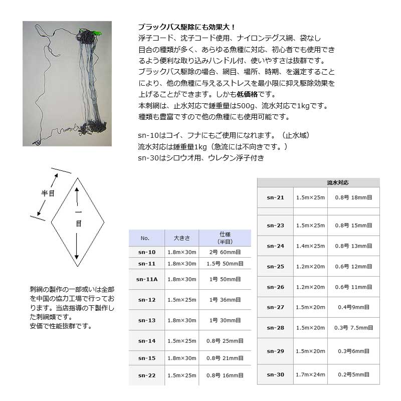 【北海道・沖縄・離島は別途運賃請求】 【画像は代表画像ですので商品名をよくご確認の上、ご購入ください。】 刺網 流水対応 網目(半目):0.8号 15mm目 大きさ:1.5m×25m 品番:sn-23 ブラックバス駆除にも効果大! 浮子コード、沈子コード使用、ナイロンテグス網、袋なし 目合の種類が多く、あらゆる魚種に対応、初心者でも使用できるよう便利な取り込みハンドル付、使いやすさは抜群です。 ブラックバス駆除の場合、網目、場所、時期、を選定することにより、他の魚種に与えるストレスを最小限に抑え駆除効果を上げることができます。しかも低価格です。 流水対応は錘重量1kgです。(急流には不向きです。) 種類も豊富ですので他の魚種にも使用可能です。 刺網の製作の一部或いは全部を中国の協力工場で行っております。 安価で性能抜群です。類似商品はこちら刺網 流水対応 0.8号 18mm目 半目 113,814円刺網 流水対応 0.8号 13mm目 半目 110,171円刺網 流水対応 0.4号 9mm目 半目 1.16,566円刺網 流水対応 0.3号 7.5mm目 半目 17,904円刺網 流水対応 0.6号 11mm目 半目 113,740円刺網 止水対応 0.8号 25mm目 半目 112,996円刺網 止水対応 0.8号 16mm目 半目 19,427円刺網 止水対応 0.8号 21mm目 半目 112,996円刺網 止水対応 1号 36mm目 半目 1.512,996円2025/11/28 更新【メーカー在庫となります。在庫切れの場合はご連絡させていただきます】【北海道・沖縄・離島送料別途見積もり商品】【お客様都合の返品の場合返品手数料がかかります】