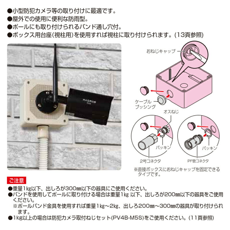 小型防犯カメラ等に取付けに最適です 屋外での使用に便利な防雨型 ポールにも取付けられるバンド通し穴付き ボックス用台座(別売り)を使えばポールに取付可能 類似商品はこちら防犯カメラ取付ボックス 露出用四角 PV4B-2,560円防犯カメラ取付ボックス 露出用四角 PV4B-5,434円防犯カメラ取付ボックス 露出用四角 PV4B-2,918円防犯カメラ取付丸ボックス PVMC-ANF カ3,046円防犯カメラ取付ボックス用 単管サポート PV42,546円防犯 カメラ用取付台座 PV4B-BDBT 取2,260円防犯カメラ取付丸ボックス PVMC-ANFK 3,490円防犯カメラ用ルーフ PV4B-RFK 取り付け3,718円防犯カメラ取り付け台座 吊りボルト用 SGT-901円2025/11/07 更新【メーカー在庫となります。在庫切れの場合はご連絡させていただきます】【北海道・沖縄・離島送料別途見積もり商品】【お客様都合の返品の場合返品手数料がかかります】