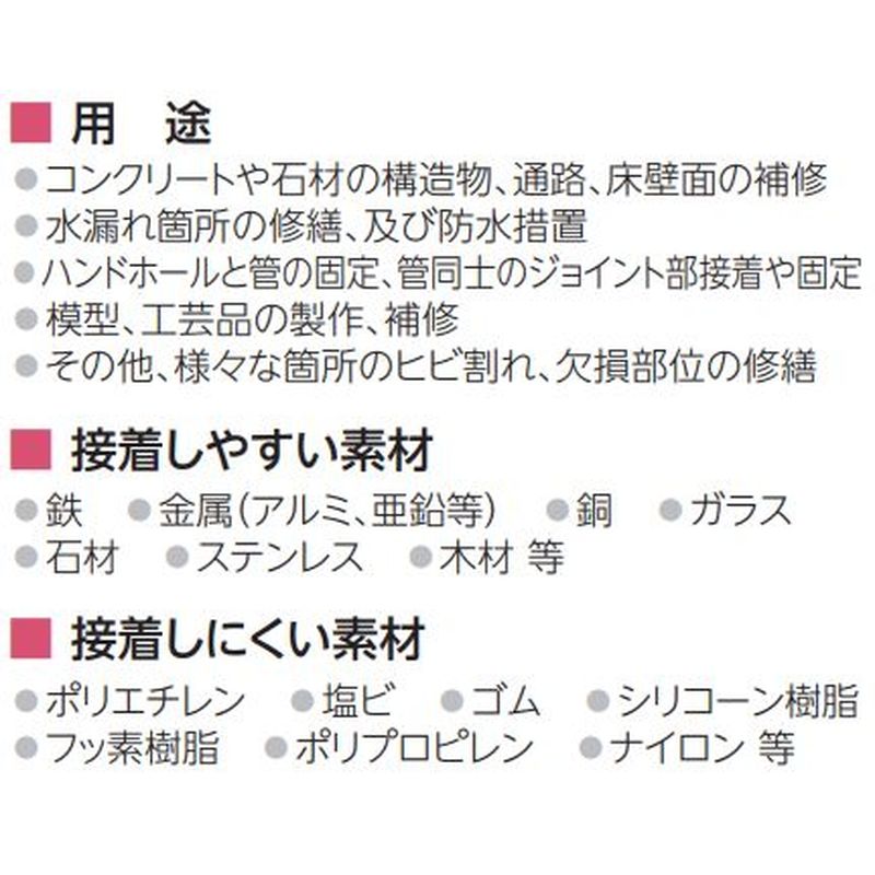 多用途で使いやすい万能型パテ状接着剤! ◆用途 コンクリートや石材の構造物、通路、床壁面の補修 水漏れ箇所の修繕、及び防水措置 ハンドホールと管の固定、管同士のジョイント部接着や固定 模型、工芸品の製作、補修 その他、様々な箇所のヒビ割れ、欠損部位の修繕 ◆接着しやすい素材 鉄、金属(アルミ、亜鉛等)、銅、ガラス、石材、ステンレス、木材 等 ◆接着しにくい素材 ポリエチレン、塩ビ、ゴム、シリコーン樹脂、フッ素樹脂、ポリプロピレン、ナイロン 等 ◆特長 パテタイプなので垂れにくく、壁面使用や巻き付け施工が可能 無溶剤タイプのため、硬化後の体積収縮や気になる刺激臭もほとんどなし 引張せん断接着力が強く、湿った面でも接着が可能 圧縮強度が高い 質量(梱包込み) 16kg 出荷単位 30セット(1箱)類似商品はこちらエポキシパテ 10個入 E-128 多用途 万20,735円シールパテ Light ライト JP-03-G1,173円穴埋め補修剤 LED-UVパテ 専用着色剤 46,507円穴埋め補修剤 LED-UVパテセット チューブ9,581円穴埋め補修剤 LED-UVパテ チューブのみ 8,294円穴埋め補修剤 LED-UVパテ 専用UVライト3,003円シールパテ JP-01G 内容量 500ml 844円不乾性パテ タイシール B-02 G B-02773円エアコン用 配管テープ 非粘着テープ JN-5441円2025/11/07 更新【メーカー在庫となります。在庫切れの場合はご連絡させていただきます】【北海道・沖縄・離島送料別途見積もり商品】【お客様都合の返品の場合返品手数料がかかります】