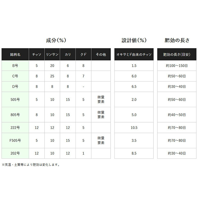 グリーンサムポット222号 種類:置肥肥料 成分:窒素 12% りん酸 12% 加里 12% 苦土 5% 設計値:オキサミド由来のチッソ 10.5% 内容量:10kg 入数:1袋 グリーンサムポットは錠剤タイプの置肥肥料です。緩効性窒素のオキサミドを含んでいるので根の生理活性を高め、植物を健全に育てます。 様々な形状(特大、大、中、小)、成分バランス、肥効目安(30〜150日)を用意しており、多岐にわたる作物・品種・鉢の大きさに対応しています。 ■ オキサミドの特徴 水に溶けにくく、熱やpHに対し安定 微生物分解型のためゆっくりとした肥効を示す 効率良く作物に利用される 根の活性を高める 環境にやさしい ■ 肥効の長さ(目安) 約70〜80日 ※気温・土質等により肥効は変化します。 大粒:直径約12 中粒:直径約9類似商品はこちら置肥肥料 グリーンサムポット 10kg 20218,619円置肥肥料 グリーンサムポット 10kg 50518,433円置肥肥料 グリーンサムポット 10kg 80518,462円置肥肥料 グリーンサムポット 10kg D号 18,519円置肥肥料 グリーンサムポット 10kg C号 18,848円置肥肥料 グリーンサムポット 10kg B号 18,376円30袋 MOX 酸素供給剤 10kg 発根促進138,138円中粒 12-12-12 プロミック錠剤 スタン13,643円大粒 12-12-12 プロミック錠剤 スタン13,643円新着商品はこちら2025/12/3受注生産 パイプ倉庫 後幕 GR-308H+341,127円2025/12/3受注生産 パイプ倉庫 後幕 GR-308H+241,127円2025/12/3受注生産 パイプ倉庫 前幕 GR-308H+264,350円再販商品はこちら2025/12/3菌床きのこ栽培セット でるまっしゅ ひらたけ 1,752円2025/12/3菌床きのこ栽培セット でるまっしゅ えりんぎ 1,752円2025/12/3菌床きのこ栽培セット でるまっしゅ えのきたけ1,752円2025/12/03 更新エムシー・ファーティコムのグリーンサムポット!