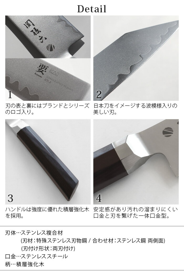 ギフト対応 ブランド 貝印 関孫六 / KAI SEKIMAGOROKU サイズ (約)幅5.1×全長33.8×厚み2.3cm刃渡り:(約)19.5cm 重 さ 約161g 素 材 刃体:ステンレス複合材刃材:特殊ステンレス刃物鋼合わせ材:ステンレス鋼 両側面口金:ステンレススチール柄:積層強化木 備 考 刃付け形状:両刃付け 素 材 自動食器洗浄機や食器乾燥機は使用不可。 漂白剤、ナイロン不織布、金属たわしは使用不可。 本品はハンドメイドのため、刃の波模様は一つ一つ異なります。 ハンドル(柄)部分の木材の色味や木目の出方には個体差があります。 使用後は汚れを落とし、水分をよく拭き取って乾燥させてください。浸け置きや汚れや水分を残したまま放置するとさびの原因になります。 新品時、木柄特有臭がすることがありますが、人体には無害です。使用と共に薄れていきます。 生産国 日本 パッケージ 化粧箱:(約)幅6.5×奥行6.5×高さ38cm 約476g※パッケージは予告なく変更する場合があります。 ■商品名 関孫六 要 切付6寸半 195mm 000AE5502 ■特典 送料無料 ポイント10倍 ■テイスト おしゃれ シンプル ■用途・シーン 貝印 KAI 関孫六 マスターライン 牛刀包丁 三徳包丁 両刃 調理器具 キッチン用品 万能 野菜 果物 肉 魚 ステンレス 日本製 家庭用 新生活 調理ツール 結婚祝い 引っ越し祝い 母の日 ■JANコード・品番 4901601177879 000AE5502 ブランド名:貝印|関孫六 ブランド名(カナ):カイジルシ|セキマゴロク シリーズ名:要 シリーズ名(カナ):カナメ キッチン用品の素材:ステンレス 刃渡り:195mm 本数:1 原産国/製造国:日本息をのむ最上の切れ味と、芸術品のような美しさ 関孫六の最高峰シリーズ「要 -kaname-」 100年以上の歴史を誇る刃物メーカー、貝印の「関孫六」は刀鍛冶の信念を受け継ぎ、切れ味と耐久性を誇る機能性に特化した刃物の調理道具ブランドです。今回ご紹介する「要」は関孫六の中でも、百貨店や一部の認められたセレクトショップのみが取り扱える最高峰シリーズ。 全てに意味を持つ、計算された刃体・ハンドル形状。使うほどに愛着がわく機能美。日本が誇る刃物の産地「関」で培われた伝統の職人技と、革新的な技術力から生み出される本品は長く愛用いただける逸品となっています。