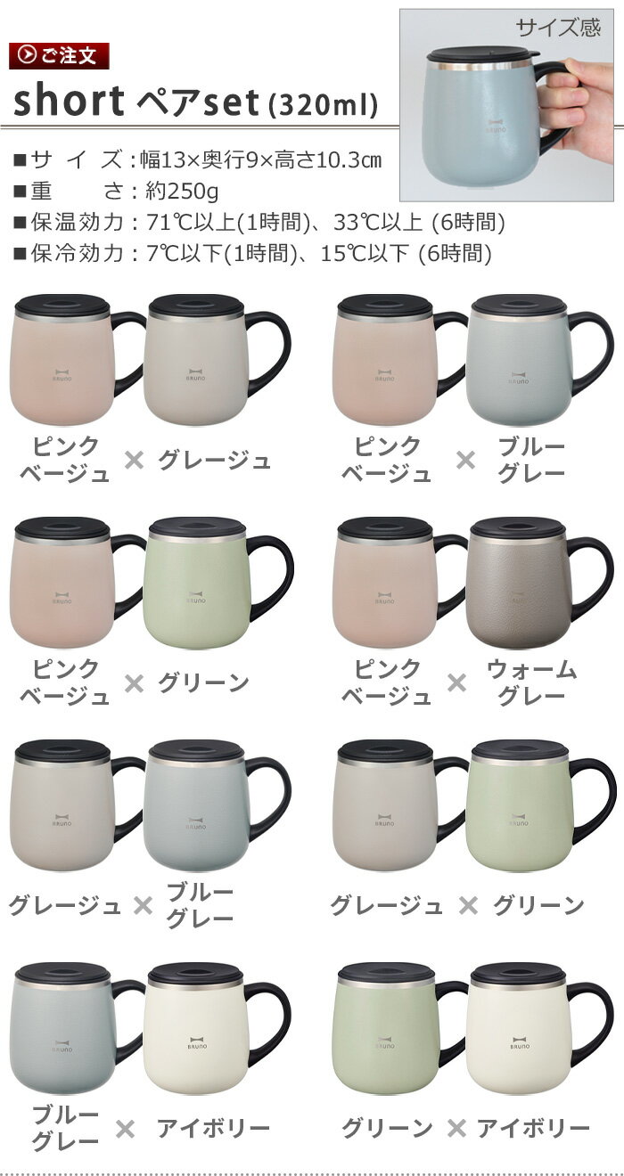 マグカップ フタ付 保温 職場 蓋付き 蓋付きマグカップ BRUNOブルーノ 蓋つきステンレスマグ ショート 320ml 2個セット保冷 マグ 保温マグカップ マグボトル 蓋付き保温 コーヒー お茶 アウトドア◇キャンプ 真空二重構造 ギフト おしゃれ 送料無料 P10倍
