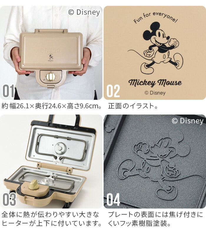 ギフト対応 ブランド BRUNO / ブルーノ サイズ (約)幅26.1×奥行24.6×高さ9.6cmコード長:約1.1m 重 量 約2.7kg(付属品を含む) 素 材 本体:フェノール樹脂、スチールプレート:アルミニウム合金(内面フッ素樹脂塗装) 電 源 AC100V 定格消費電力 900W 内 容 本体×1、ホットサンドプレート×1、ミニケーキプレート×1 安全装置 サーモスタット、温度ヒューズ(216℃) 備 考 ・タイマー付き・プレート取りはずし可 ご注意 食器洗い機、食器乾燥機は使用不可トマトなどのように色染みの付きやすい食材や、キムチやタバスコのように濃い色で塩分が強く酸性の強い食材の場合は、色染みが発生する場合があります。調理物の汚れが残ったまま放置しないでください。洗浄には台所用中性洗剤をご使用ください。ベンジン・シンナー・アルコール・ハミガキ粉・たわしなどは使用しないでください。本体は丸洗いできません。本体の汚れは水を含ませた布、台所用中性洗剤を含ませた布で拭き取って下さい。 保証期間 お買い上げから1年間 パッケージ 化粧箱入り:(約)幅29.1×奥行16.5×高さ30.6cm※パッケージは予告なく変更する場合があります。 ■商品名 ディズニー×ブルーノ ホットサンドメーカー ダブル DISNEY×BRUNO HOT SAND MAKER DOUBLE ■特典 送料無料 ポイント10倍 ■テイスト おしゃれ かわいい ベージュ ■用途・シーン ディズニー ブルーノ ミッキーマウス ホットサンドメーカー 電気 2枚 キャラクター 耳まで 耳まで焼ける タイマー付き サンドイッチ ホットプレート プレスサンドメーカー おすすめ ホットサンド ミニケーキ 人形焼き おうちカフェ 食パン 朝食 ランチ おやつ 軽食 ミニー ドナルド デイジー ■JANコード・品番 4514499180281 BOE136-BE メーカー希望小売価格はメーカーサイトに基づいて掲載しています TOPページ 該当ページ サイトの運営者ミッキーたちの焼き目がつけられるホットサンドメーカー BRUNOの出来立てあつあつが食卓で味わえる大人気ホットサンドメーカーに、ディズニーデザインが仲間入り! クラシックなアメリカンダイナーを感じさせるカラーに、さりげないミッキーのイラストがアクセントに。パンと具材をのせたらタイマーをセットするだけで簡単にミッキーたちの焼き目がついたかわいいホットサンドがつくれます。本体は縦置き可能&電源コードは底面に巻きつけられるので、収納もすっきり。パンの耳までカリッとおいしいホットサンドが毎日手軽に愉しめます。