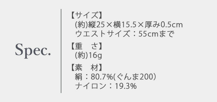 ギフト対応 ブランド 上州絹屋 サイズ (約)縦25×横15.5×厚み0.5cmウエストサイズ:約55cmまで 重 さ 約16g 素 材 絹:80.7%(ぐんま200)ナイロン:19.3% 生産国 日本 ご注意 大変デリケートな素材ですので手洗いをおすすめします。 中性洗剤をご使用の上、水温は40℃以下にしてください。漂白剤は使用しないでください。 タンブラー乾燥、およびドライクリーニングは避けてください。 紫外線で変色する恐れがあります。風通しの良い場所で陰干ししてください。 当て布を使用してアイロン(中温)がけが可能です。 素材の性質上、パイルが引っ掛かりやすくなっていますのでご注意ください。 パッケージ 箱入り:(約)幅14.5×奥行8×高さ4cm 約67g※仕様は予告なく変更する場合があります。 ■商品名 シルキーハラマキ for baby ■テイスト おしゃれ 上品 シンプル 無地 単色 なめらか かわいい ■カラー ブルー グレー オレンジ 青 ■用途・シーン 腹巻 子供用 キッズ ベビー はらまき ぐんま200 子ども シルク コットン 腹巻き 絹 インナー 薄手 おすすめ 冷え性 日本製 代謝up あったか 冷え取り シルキー 赤ちゃん ヘアバンド ヘアーバンド ギフト プレゼント 出産祝い 父の日 母の日 敬老の日 ■JAN・型番 4573160270584 4573160270591 4573160270607 JSKNT017-BL JSKNT017-GY JSKNT017-OR安心安全!希少な純国産高級絹糸使用お肌にやさしいベビー用腹巻 群馬県オリジナル蚕品種の繭を使った純国産の希少な絹糸を使用した、新生児から使用できるベビー用腹巻のご紹介です。「上州絹屋」の製品は養蚕から加工・製造まで一貫して日本国内で行なっている完全純国産の絹製品です。薬剤を使用しない製糸方法を用いて製糸しており、赤ちゃんのお肌にも安心してお使いいただけます。シルクの調湿・保温効果により体を冷やさず、蒸れないため、汗をかきやすい赤ちゃんにぴったりです。