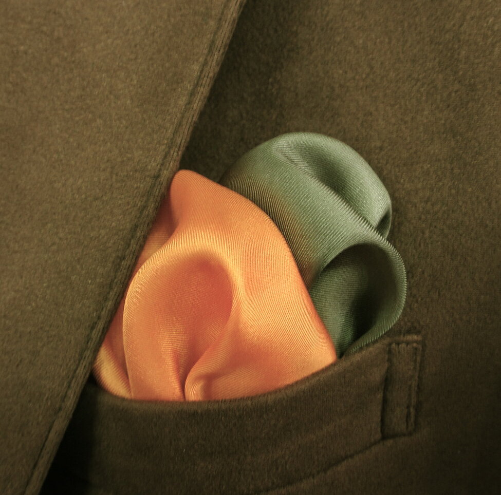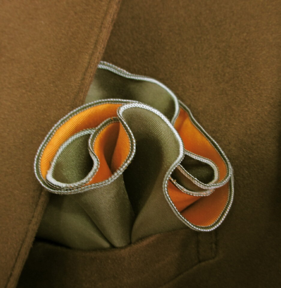 二色の生地を二重にパイピング縫製した中空のラウンドチーフです。 フチの糸色は好評をいただいている2色で、本体2色の地色と同系にすることで嫌味はなくとても華やかで使いやすい円形チーフとなりました。 フチを出さなければ普通のチーフの見せ方も出来ます。全8色 サイズ:直径約28cm(中空二枚合わせ) 品質:日本製(横浜自社製) シルク100% カラー:モスグリーン/マリーゴールド(巻糸カラー:オフベージュ/モスグリーン) TPO:オールラウンドに対応(特にパーティーやブライダル用にGOOD) ※プレゼント用にも使えるオリジナルパッケージはチーフ1枚ごとに付属します(3枚の場合は3パッケージ付属)デザイン・裁断及び縫製は横浜の自社で行っています