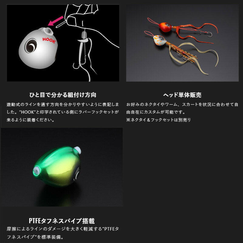 ●商品名に【同梱不可】【他商品同時注文不可】と記載されている商品は別倉庫から発送となるため同梱できません。システム上、同時注文が可能ですが、その際は勝手ながらキャンセルとさせて頂きます。キャンセルに伴い、各種キャンペーンの適用など取消となりますが、ご注文条件やポイントの補填・補償等は一切お受けできかねます。また、再度ご注文いただく際に完売となっている場合や、キャンペーン条件が異なる場合がございます。●掲載商品は複数サイトおよび実店舗で併売しています。ご注文タイミングにより欠品し、お取り寄せにお時間を頂く場合やお手配が出来ずにやむを得ずキャンセルさせて頂く場合がございます。●商品画像は代表画像です。仕様変更により商品スペックやパッケージなど変更となる場合がございます。仕様変更に伴う返品、商品交換の際の往復送料はお客様ご負担となります。●店舗都合・お客様都合に依らずご注文内容の修正やキャンセルを行った際に在庫なしとなる場合やポイント、クーポンなど各種キャンペーンが適用外となる場合がございます。大変恐縮ながらこのような場合でも補填などは出来かねますのでご了承下さい。【ジャッカル/JACKALL】ドテラ・キャスティングに最適。斜め引きをした際の浮き上がりを重視した雷流ヘッドNEOは、ドテラ流しやキャスティングタイラバでより多くのリフト&フォールを可能にし、バイトチャンスを増やします。高比重タングステン素材により、コンパクトなシルエットと素早い沈下を実現。また、タングステンは硬度も高いため、着底の瞬間や底質の変化などのあらゆる情報をユーザーまで届けます。さらに、軽い巻き抵抗により、小さなバイトや僅かな潮流の変化も感じ取ることができます。[TG BINBIN DAMA SLIDE RAIRYUHEAD NEO][22new16]カラー:F289 オレンジゴールドNEOサイズ:100自重:100g釣り方、フィールド:ソルトルアー(オフショア)代表対象魚:タイ(鯛)≪関連商品≫F289 オレンジゴールドNEO 100 TKM-16-08-07