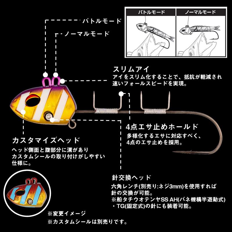 ●商品名に【同梱不可】【他商品同時注文不可】と記載されている商品は別倉庫から発送となるため同梱できません。システム上、同時注文が可能ですが、その際は勝手ながらキャンセルとさせて頂きます。キャンセルに伴い、各種キャンペーンの適用など取消となりますが、ご注文条件やポイントの補填・補償等は一切お受けできかねます。また、再度ご注文いただく際に完売となっている場合や、キャンペーン条件が異なる場合がございます。●掲載商品は複数サイトおよび実店舗で併売しています。ご注文タイミングにより欠品し、お取り寄せにお時間を頂く場合やお手配が出来ずにやむを得ずキャンセルさせて頂く場合がございます。●商品画像は代表画像です。仕様変更により商品スペックやパッケージなど変更となる場合がございます。仕様変更に伴う返品、商品交換の際の往復送料はお客様ご負担となります。●店舗都合・お客様都合に依らずご注文内容の修正やキャンセルを行った際に在庫なしとなる場合やポイント、クーポンなど各種キャンペーンが適用外となる場合がございます。大変恐縮ながらこのような場合でも補填などは出来かねますのでご了承下さい。DAIWA船タチウオテンヤと言えば「快適船タチウオテンヤSS」。このベストセラーを継承しつつ、より使いやすく、新機能を搭載したNEWモデルが登場しました。「ST」はStandard、Stayの意味を持ち、テンヤを止めたい時にしっかり止まるヘッド形状が特徴です。アイの高さを抑えることで、抵抗が軽減されフォールスピードが向上しました(スモールアイ仕様)。さらに、ヘッドのゼブラ部分や腹部分にシールを貼ることで、好みのカラーにカスタマイズすることが可能です(シールは別売り)。また、AHシリーズの針とも交換できるHC(Hook Change)針交換機能を搭載しています。[FUNE TACHIUO TENYA SS ST]※本製品は針交換固定タイプになりますが、ヘッド・針を交換する際の溝に若干の空きスペース(それによるがたつき)があることがございますが、予めご了承ください。セット商品/付属品:エサ巻きソフトステン線 100cm×1個カラー:ケイムラアカキンサイズ:50号釣り方、フィールド:船釣り(浅場)代表対象魚:タチウオ(太刀魚) TKM-12-26-05