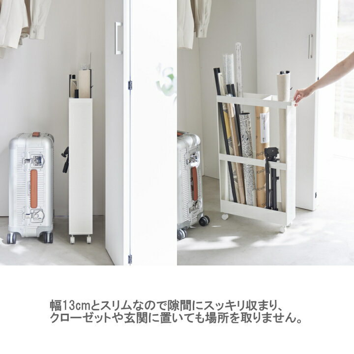ROLLING CART for long item tower キャスター付き長物収納スリムワゴン 保管場所に困りがちなポスターやタペストリー、スケートボードやラケットなどのスポーツ用品や、ほうき・ワイパーといった掃除用品の収納に便利なワゴンです。長さのあるものをたてて収納できます。幅13cmとスリムなので隙間にスッキリ収まりクローゼットや玄関に置いても場所を取りません。 商品名 長物収納スリムワゴン SIZE 幅130×奥行480×高さ805mm 約6.45kg MATERIAL スチール(粉体塗装) ナイロン樹脂(キャスター) 備考 *組み立て式 *耐荷重:8kg *メーカーより直送の為、代引きはご利用いただけません。 *沖縄県・離島宛には発送できません。(キャンセル処理いたします)ROLLING CART for long item tower キャスター付き長物収納スリムワゴン 保管場所に困りがちなポスターやタペストリー、スケートボードやラケットなどのスポーツ用品や、ほうき・ワイパーといった掃除用品の収納に便利なワゴンです。長さのあるものをたてて収納できます。 幅13cmとスリムなので隙間にスッキリ収まりクローゼットや玄関に置いても場所を取りません。 4個あるキャスターのうち2個はストッパー付きなのでロックしておけば勝手に動く事もなく安心です。 フレーム部分に掃除用のスプレーボトルを引っ掛けて収納もできます。掃除用具をまとめる収納ワゴンとしても便利に使えます。 1)省スペースの隙間にもぴったり収まるキャスター付きスリムワゴン。 2)長さのあるものをたてて収納。 3)保管場所に困りがちなポスターやタペストリーも収納。 4)隙間にもぴったり入り込みとても便利。 5)掃除用具をまとめる収納ワゴンとしても便利。 商品名 長物収納スリムワゴン SIZE 幅130×奥行480×高さ805mm 約6.45kg MATERIAL スチール(粉体塗装) ナイロン樹脂(キャスター) 備考 *組み立て式 *耐荷重:8kg *メーカーより直送の為、代引きはご利用いただけません。 *沖縄県・離島宛には発送できません。(キャンセル処理いたします)